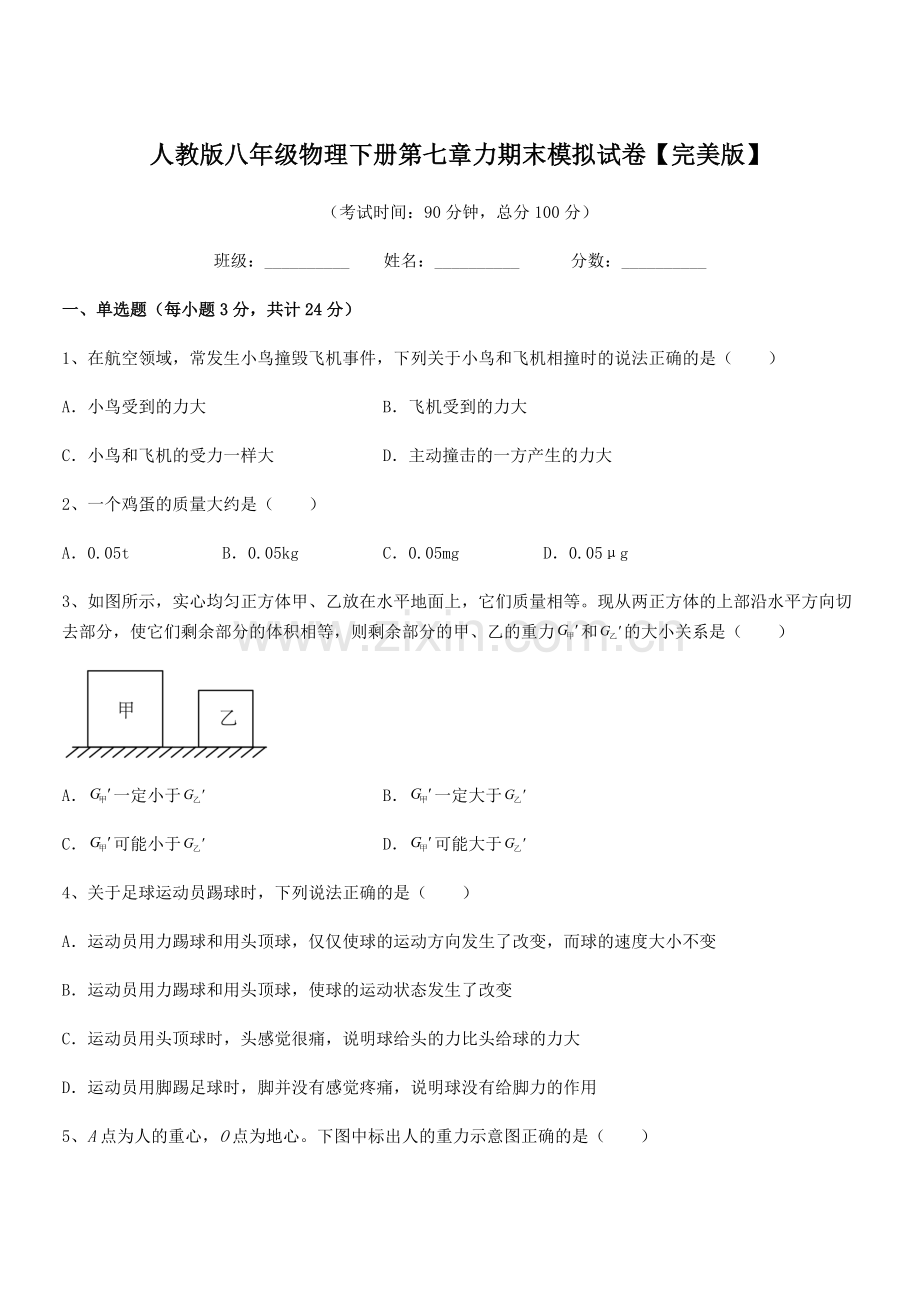 人教版八年级物理下册第七章力期末模拟试卷【完美版】
