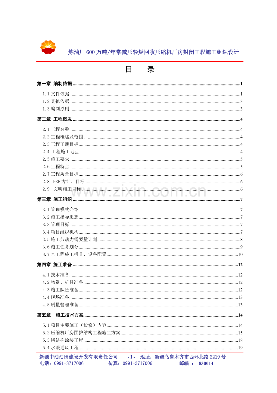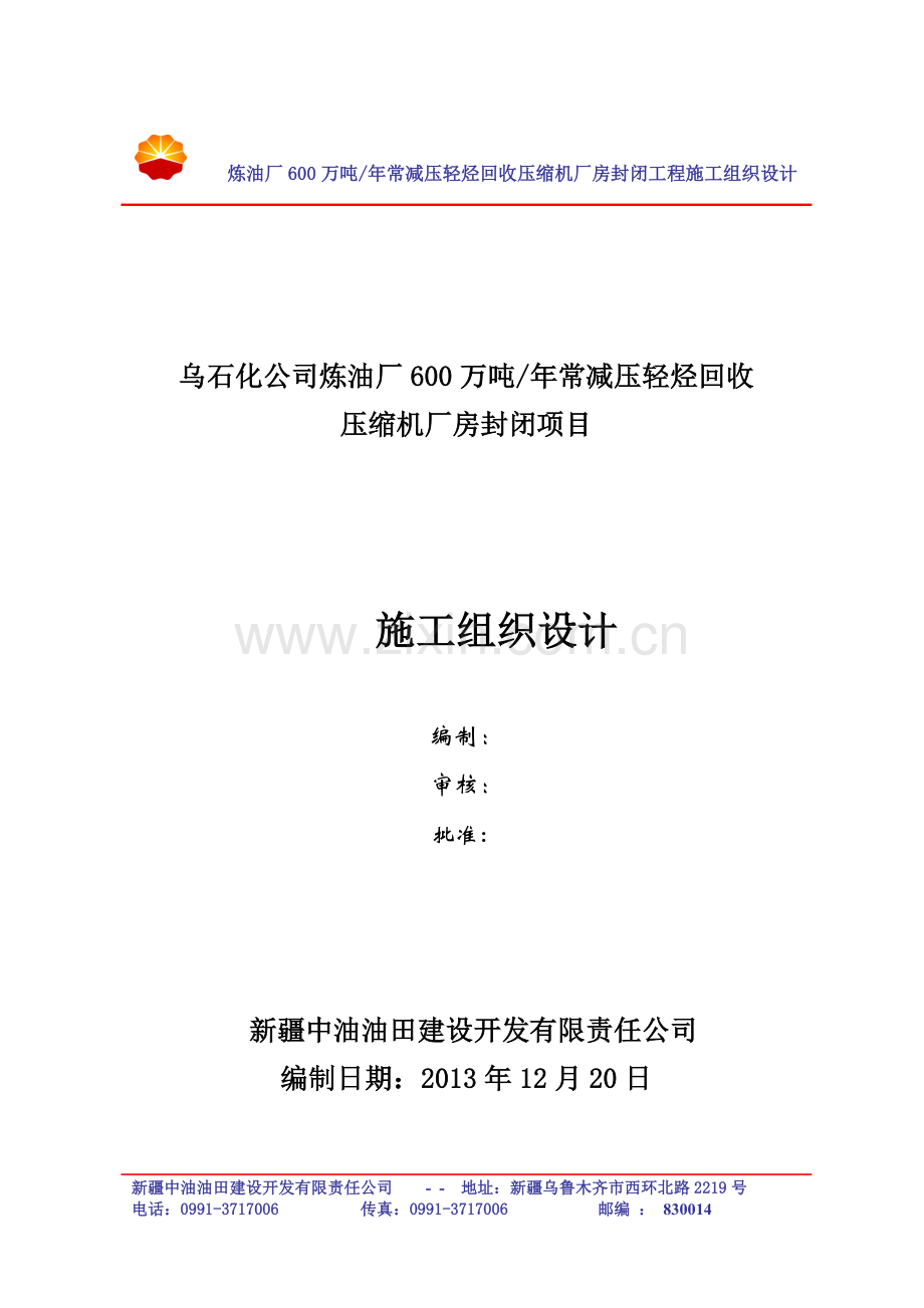 炼油厂600万吨/年常减压轻烃回收压缩机厂房封闭工程施工组织设计