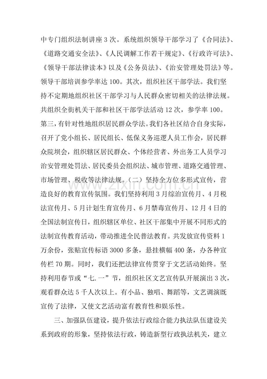 三、加强队伍建设,提升依法行政综合能力执法队伍建设关系到政府的形象,坚持依法行政,铸造新型行政执法机关,建立和培养一支高素质的执法队伍是首要前提。一是把好培训关。乡镇(街道)机构改革后,针对人员变动情况我们组织了一期专门培训。内容主要有:强化纪律严明、令行禁止的作风;学习上级文件、规章制度和执法手册,贯彻依法行政理念和原则;进行“五法”学习;组织与执法七大职能相关的法律法规和执法业务培训,掌握执法技能和技巧;学习国家公务员常识,提升公务员素质。二是把好制度管理关。先后建立和制定了《机关管理制度》、《各办、中心人员岗位职责》、《行政执法值勤考核办法》、《执法人员十不准》等规章制度10多项,并落实用制度管人管事,促进依法行政。通过严格把关,努力铸造一支政治强、思想好、业务精、作风硬、纪律严、廉洁高效的执法队伍。四、加强依法治理,促进社会法治化管理(一)开展“民主法治示范社区”创建活动。开展法制文明建设创建活动,是维护稳定,确保一方平安,实现依法治街工作的重点工程,是社区民主法制建设与社会治安综合治理的有机结合,是狠抓社区面上的建设,促进依法治理的又一侧重点。在创建活动中,我们主要做了以下四个方面的工作:一是制定规划,完善制度,使其规范化制度化发展。我们成立了法制文明建设工作领导小组,坚持制定了创建工作意见,印发了法制文明小区标准。坚持机关干部分别联系社区、企业的制度和办公室检查督促的制度,把全街各小区工作责任分别落实到人头;同时各社区制定和完善了司法职责,安置帮教工作职责,法制工作职责,调解委员会工作职责,人民调解委员会岗位责任制;社区刑释解教人员回归衔接制度、违法青少年帮教工作职责、社区法律服务志愿者工作职责、基层法律援助工作制度等九项制度、职责。二是狠抓创建工作的基础工作,使创建工作扎实有效发展。创建法制文明小区活动,安全、文明是根本,是基础。因此,我们全街是成栋楼房的,都分别落实了守楼护院人员,对于不是成栋楼房的院坝,也分别建立了看门望户点,落实了守护人员,同时还建立了联防治安室、治保会、调解委员会、义务巡逻队,每个社区建立了司法。另外,我们还与派出所一道,坚持对各小区治安状况进行定期分析,对出现的不安全隐患,及时组织力量进行排查、治理。如上半年,我们针对抢劫、盗窃案时有发生的状况,一方面加强了夜间巡逻的管理,要求各社区巡逻人员必须准时到岗。一方面组织派出所、社区干部集中时间、集中人力进行专项治理,使各社区治安状况得到了根本好转。三是开展各种活动,赋予创建活动新内容。结合我街实际,坚持开展了“十星户”评选活动,广泛开展了“一帮一”活动。四是坚持评比、表彰制度。我们坚持每半年对创建工作情况进行初查,对检查出的问题及时提出整改措施,年底进行全面检查考核。通过以上创建活动的开展,有效地促进了依法治街工作的深入发展,使辖区责任范围没有出现一起集体上访案,没有一起民转刑案件发生,辖区治安稳定、社会秩序良好、人民群众安居乐业。