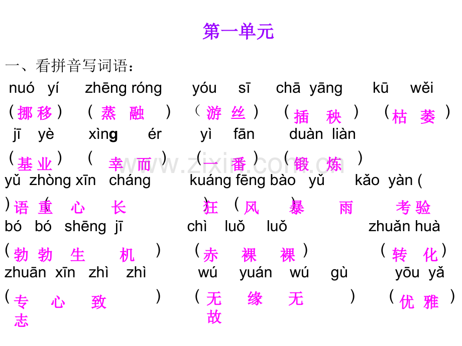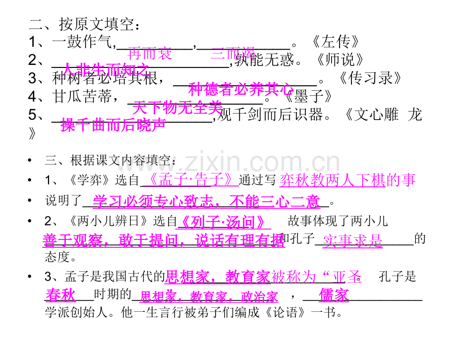 一、看拼音写词语:nu y zhn rn yu s ch yn k wi ()()()()()j y xn r y fn dun lin ()()()()y zhn xn chn kun fn bo y ko yn()()()b b shng j ch lu lu zhun hu()()()zhun xn zh zh w yun w yu y()()()第一单元第一单元挪挪移移蒸蒸融融游游丝丝插插秧秧枯枯萎萎基基业业幸幸而而一一番番锻锻炼炼语语重重心心长长狂狂风风暴暴雨雨考考验验勃勃勃勃生生机机赤赤 裸裸 裸裸转转 化化专专心心致致志志无无缘缘无无故故优优雅雅二、按原文填空:1、一鼓作气,_,_。左传 2、_,孰能无惑。师说 3、种树者必培其根,_。传习录4、甘瓜苦蒂,_。墨子 5、_,观千剑而后识器。文心雕 龙三、根据课文内容填空:1、学弈选自_ 通过写说明了_ _。2、两小儿辨日选自_ 故事体现了两小儿_和孔子_的态度。3、孟子是我国古代的 _ 。孔子是_时期的_ ,_学派创始人。他一生言行被弟子们编成论语一书。再而衰 三而竭人非生而知之人非生而知之种德者必养其心种德者必养其心天下物无全美天下物无全美操千曲而后晓声操千曲而后晓声孟子告子 弈秋教两人下棋的事 学习必须专心致志,不能三心二意学习必须专心致志,不能三心二意 列子列子汤问汤问 善于观察,敢于提问,说话有理有据善于观察,敢于提问,说话有理有据 实事求是 思想家,教育家思想家,教育家被称为“亚圣”春秋春秋 思想家,教育家,政治家思想家,教育家,政治家 儒家儒家 4、为是其智弗若于?曰:非然也。_ _ _ _ _ _ _ _ _ 。5、我以日始出时去人近,而日中时远也。_ _ _ _ _ _ _。6、孰为汝多知乎?_?7、文章紧扣匆匆写了_,表达了作者_。课文运用了_修辞方法,开头结尾都用了_首尾呼应,突出时间来去匆匆的_与_强烈情感。8、桃花心木一文中树的生长“不确定”指_人生活的不确定指_ _ 桃花心木在不确定中_树似人,人如树,这篇课文是_的表达方法巧妙。难道是因为他的智力不如别人好吗?回答说:不是这样的。难道是因为他的智力不如别人好吗?回答说:不是这样的。我认为太阳刚出来的时候离人近一些,而中午的时候离人远一些。我认为太阳刚出来的时候离人近一些,而中午的时候离人远一些。谁说你的知识渊博呢?谁说你的知识渊博呢?时光流逝的踪迹时光流逝的踪迹 对时光流逝的无奈和惋惜对时光流逝的无奈和惋惜 拟人、比喻、排比、反问拟人、比喻、排比、反问等等 设问句设问句 惋惜 无奈 老天下雨、种树人浇水没规律。老天下雨、种树人浇水没规律。生活中不可预知的坎坷、曲折、磨难生活中不可预知的坎坷、曲折、磨难。寻找水源、拼命扎根,就能长成百年大树,显示出勃勃生机。寻找水源、拼命扎根,就能长成百年大树,显示出勃勃生机。人在人在不确定中生活,不确定中生活,经历风雨和磨难就能成为意志坚强有所作为的人。经历风雨和磨难就能成为意志坚强有所作为的人。借物喻人借物喻人 第二单元第二单元一、看拼音写词语一、看拼音写词语:l yu ch xn zhn ln jio zi fi cu()()()()()z bn r ci pi sun bn bo zh l zi ()()()()()zhn zi zhng dn ji ci wn xin gn xn()()()ling q b su gun mio hu fnzhen y bi()()()()bin po ji rn s yun ci hu mi y tn()()()()()腊腊月月初初旬旬展展览览饺饺子子翡翡翠翠杂拌儿杂拌儿榛榛子子更更新新彩彩排排蒜蒜瓣瓣爆爆竹竹张张灯灯结结彩彩万万象象零零七七八八碎碎逛逛庙庙会会风风筝筝预预备备鞭鞭炮炮截截然然寺寺院院彩彩绘绘麦麦芽芽糖糖栗栗子子二、按要求默写:元日爆竹声中一岁除,春风送暖入屠苏。千门万户曈曈日,总把新桃换旧符。天竺寺八月十五夜桂子玉颗珊珊下月轮,玉颗珊珊下月轮,殿前拾得露华新。殿前拾得露华新。至今不会天中事,至今不会天中事,应是嫦娥掷与人。应是嫦娥掷与人。宋宋王安石王安石 唐唐皮日休皮日休三、根据课文内容填空:1、北京的春节详细描写了过春节的四次高潮:2、本文按_的顺序对_ 四部分写的详细,其它的部分写的简略这样写的好处是_。3、藏戏开头运用了_它的作用是 _ _ _ 。文章还用了_的结构形式。4各具特色的民居是一篇_作者用_等方法介绍了_和_。5、和田的维吾尔运用了_的写法。作用是_还用了_的写法。文章出现的修辞方法有_。(1)腊八熬腊八粥、跑腊八蒜。腊八熬腊八粥、跑腊八蒜。(2)除夕夜家家灯火通宵,鞭炮声日夜不绝,吃团圆饭、守岁。除夕夜家家灯火通宵,鞭炮声日夜不绝,吃团圆饭、守岁。(3)初一男人们外出拜年,女人们在家招待客人,小孩逛庙会。)初一男人们外出拜年,女人们在家招待客人,小孩逛庙会。(4)十五观花灯,放鞭炮,吃元宵。)十五观花灯,放鞭炮,吃元宵。时间腊八、除夕、初一、元宵点面结合、重点突出、主次分明、印象深刻点面结合、重点突出、主次分明、印象深刻三个排比反问句三个排比反问句 强调藏戏的三个特点,为下文做铺垫强调藏戏的三个特点,为下文做铺垫。总分总总分总说明文说明文列数字、打比方、举例子、下定义、引用、列数字、打比方、举例子、下定义、引用、客家民居客家民居傣家竹楼傣家竹楼对比对比突出了维吾尔的豪气与乐观突出了维吾尔的豪气与乐观 首尾呼应首尾呼应 比喻、拟人、反问比喻、拟人、反问 第三单元第三单元一、看拼音写词语:sh j hn h chu ti kn b c bo m gu ()()()()()()fi t j li w tu b xu xng wn ji ji ()()()()()()i s k xn jn bn jin zhn s d q su()()()()zhny ti shn qn y hnmo lun pn pn ()()()jin ru chu sh yun fi pn cn bo()()()()书籍书籍含糊含糊抽屉抽屉恐怖恐怖