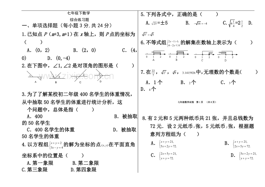 8.有2元和5元两种纸币共21张,并且总钱数为72元.设2元纸币张,5元纸币张,根据题意列方程组为( )