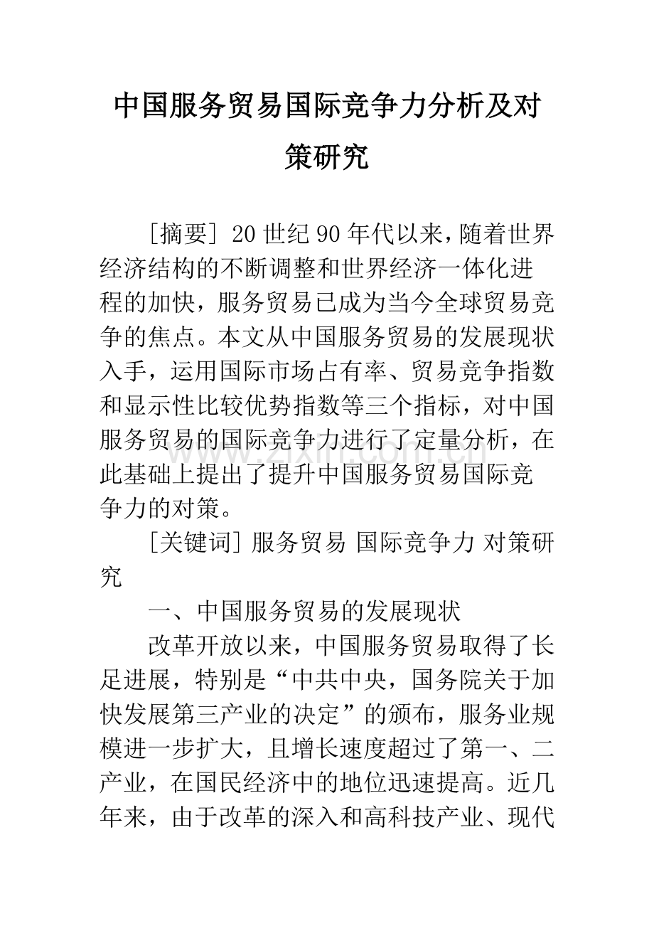 袁其刚时英张伟:我国服务贸易国际竞争力比较及对策分析[J].商业研究,2006(23) [摘要] 20世纪90年代以来,随着世界经济结构的不断调整和世界经济一体化进程的加快,服务贸易已成为当今全球贸易竞争的焦点。本文从中国服务贸易的发展现状入手,运用国际市场占有率、贸易竞争指数和显示性比较优势指数等三个指标,对中国服务贸易的国际竞争力进行了定量分析,在此基础上提出了提升中国服务贸易国际竞争力的对策。