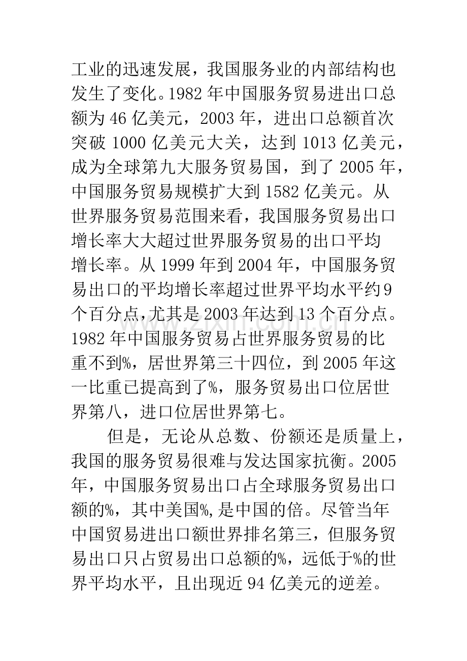 改革开放以来,中国服务贸易取得了长足进展,特别是“中共中央,国务院关于加快发展第三产业的决定”的颁布,服务业规模进一步扩大,且增长速度超过了第一、二产业,在国民经济中的地位迅速提高。近几年来,由于改革的深入和高科技产业、现代工业的迅速发展,我国服务业的内部结构也发生了变化。1982年中国服务贸易进出口总额为46亿美元,2003年,进出口总额首次突破1000亿美元大关,达到1013亿美元,成为全球第九大服务贸易国,到了2005年,中国服务贸易规模扩大到1582亿美元。从世界服务贸易范围来看,我国服务贸易出口增长率大大超过世界服务贸易的出口平均增长率。从1999年到2004年,中国服务贸易出口的平均增长率超过世界平均水平约9个百分点,尤其是2003年达到13个百分点。1982年中国服务贸易占世界服务贸易的比重不到%,居世界第三十四位,到2005年这一比重已提高到了%,服务贸易出口位居世界第八,进口位居世界第七。