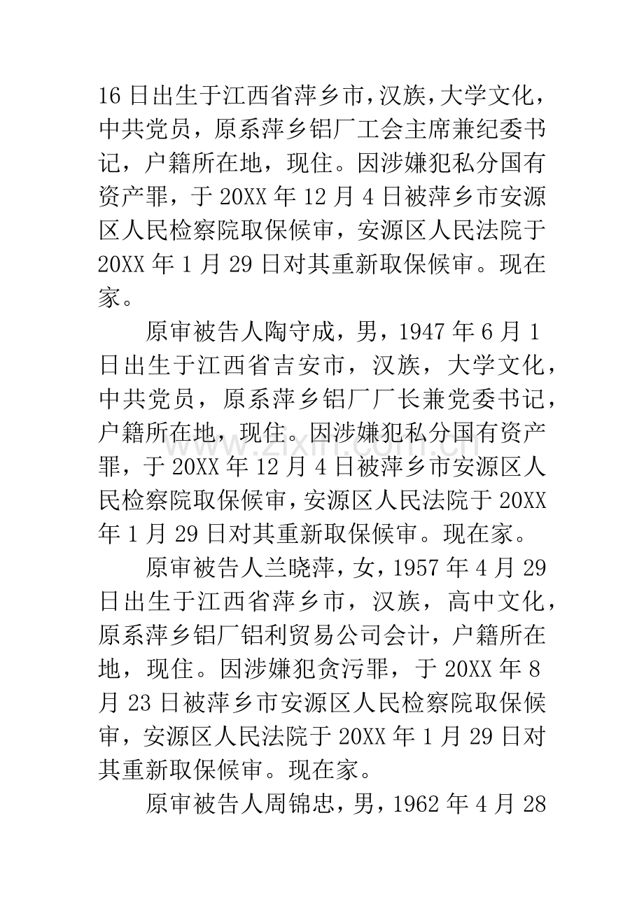 原审被告人陶守成,男,1947年6月1日出生于江西省吉安市,汉族,大学文化,中共党员,原系萍乡铝厂厂长兼党委书记,户籍所在地,现住。因涉嫌犯私分国有资产罪,于20XX年12月4日被萍乡市安源区人民检察院取保候审,安源区人民法院于20XX年1月29日对其重新取保候审。现在家。