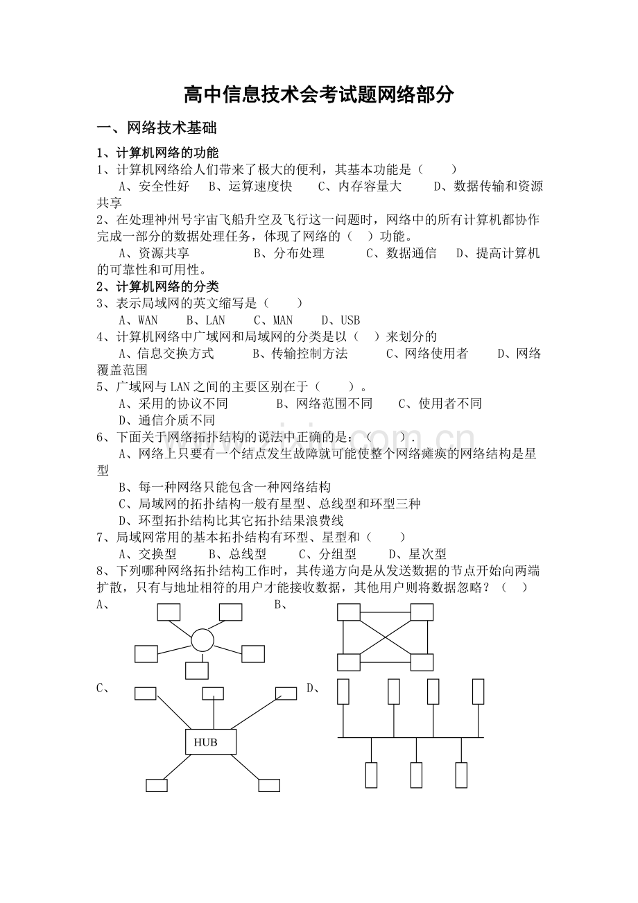 高中信息技术会考试题网络部分