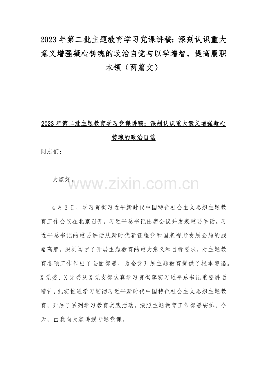 2023年第二批主题教育学习党课讲稿:深刻认识重大意义增强凝心铸魂的政治自觉与以学增智,提高履职本领(两篇文)