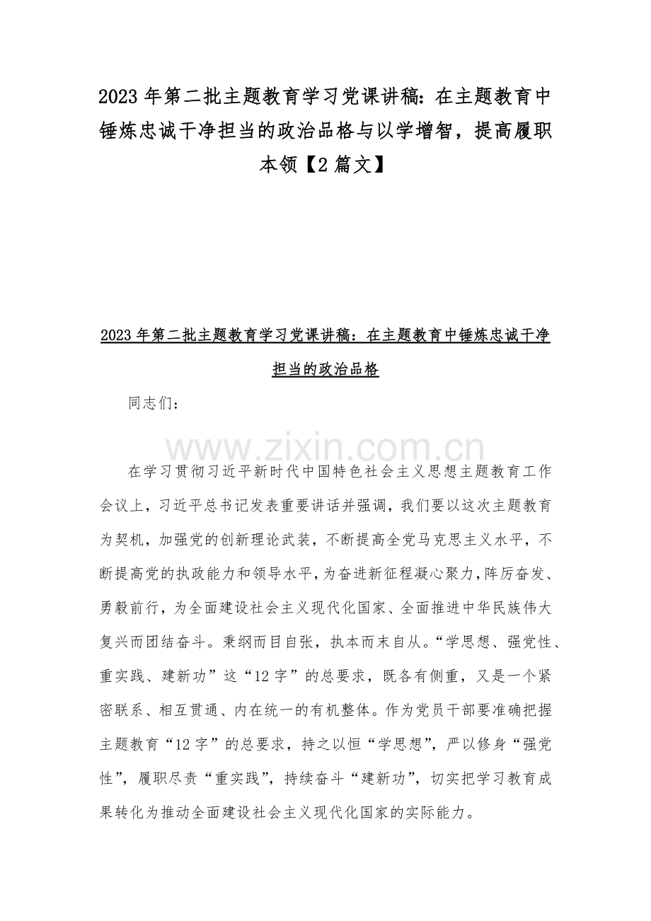 2023年第二批主题教育学习党课讲稿:在主题教育中锤炼忠诚干净担当的政治品格与以学增智,提高履职本领【2篇文】