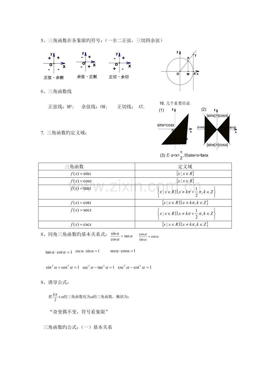 5、三角函数在各象限旳符号:(一全二正弦,三切四余弦)