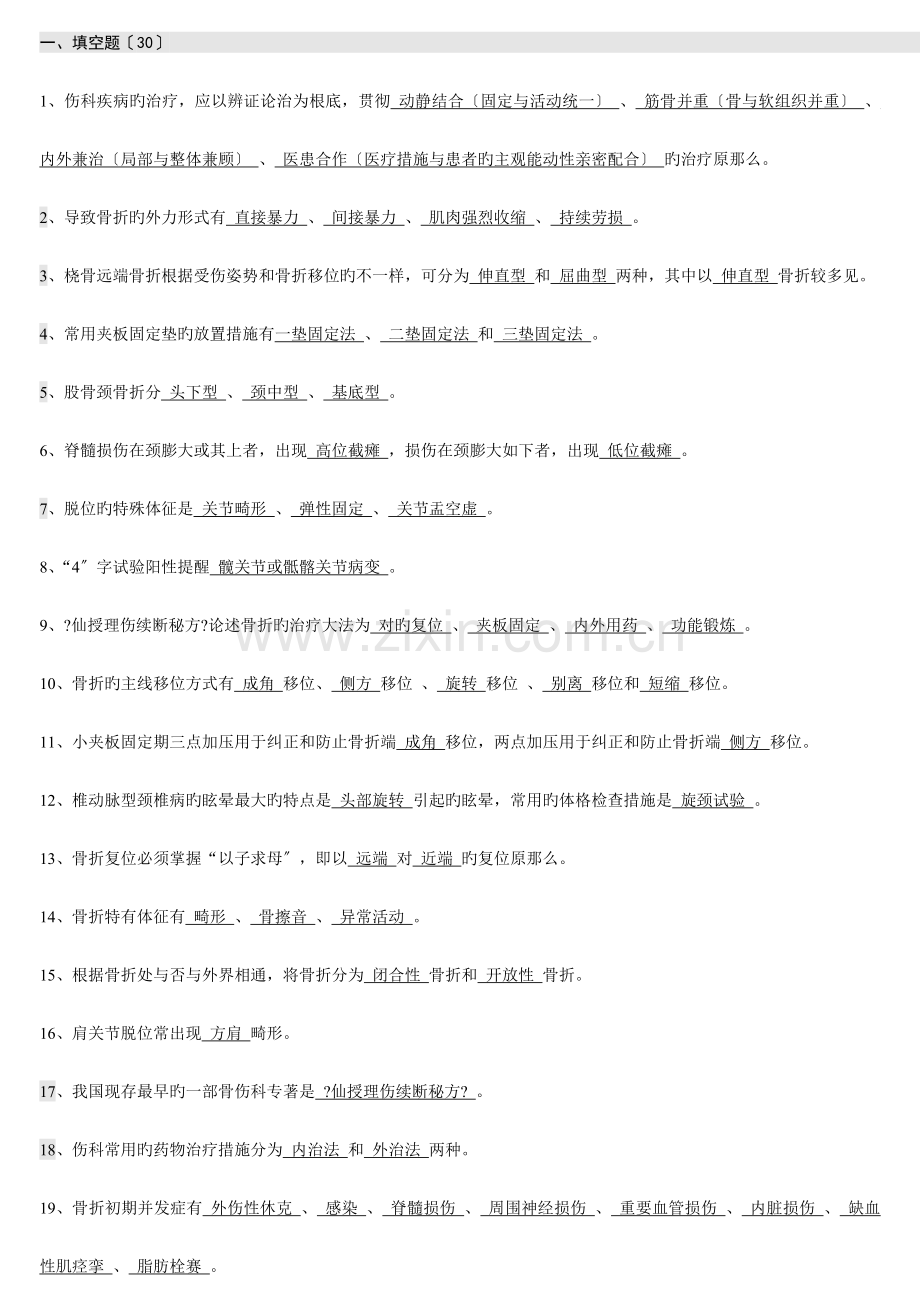 25、骨折晚期旳并发症有 坠积性肺炎 、 褥疮 、 尿路感染及结石 、 损伤性骨化 、 缺血性骨坏死 、 创伤性关节炎 、 关节僵硬 、 迟发型畸形 。