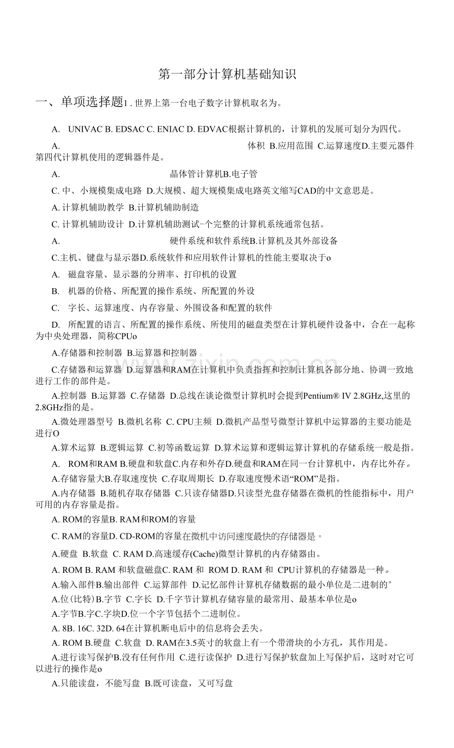 一、单项选择题1 .世界上第一台电子数字计算机取名为。