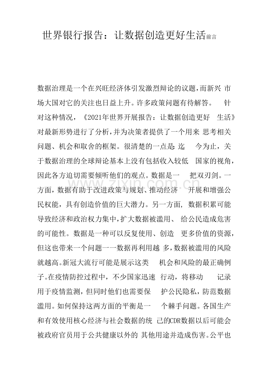 数据治理是一个在兴旺经济体引发激烈辩论的议题,而新兴 市场大国对它的关注也日益上升。许多政策问题有待解答。 针对这种情况,《2021年世界开展报告:让数据创造更好 生活》对最新形势进行了分析,并为决策者提供了一个用来 思考相关问题、机会和取舍的框架。很清楚的一点是:迄 今为止,关于数据治理的全球辩论基本上没有包括收入较低 国家的视角,因此各方迫切需要倾听他们的观点。数据是一 把双刃剑。一方面,数据有助于改进政策与规划、推动经济 开展和增强公民权能,具有创造价值的巨大潜力。另一方面, 数据积累可能导致经济和政治权力集中,扩大数据被滥用、 给公民造成危害的可能性。数据是一种可以反复使用、创造 更多价值的资源,但这也带来一个问题一一数据再利用越 多,数据被滥用的风险就越高。新冠大流行可能是展示这类 机会和风险的最正确例子。在疫情防控过程中,不少国家迅速 行动,将移动 记录用于疫情监测,但同时他们也需要保 护公民隐私,防范数据滥用。如何保持这两方面的平衡是一 个棘手问题。各国生产和有效使用核心经济与社会数据的统 己的CDR数据以后可能会被政府官员用于公共健康以外的 其他用途并造成伤害。公平也是一个重要问题。像以色列这 样一个高收入国家,智能手机普及率为93% ;而在冈比亚 这个低收入国家,智能手机普及率只有75%o不管哪个国家 都有一些没有智能手机的人无法生成CDR数据,也就未必 会直接受益于接触追踪措施提供的公共卫生保护。上述例子 也说明了一个关键难题。随着更多数据(尤其是个人数据) 被共享和再利用,通过政策和服务交付改进带来的好处会大 幅增加,但是数据被滥用的风险也会上升。实现这些好处要 求提供或交换数据,但有关各方必须信任这种数据交流所依 赖的系统、法规和制度,这样他们才会自愿参与进来。怎样 才能使人们相信他们的数据将受到保护而且他们可以从数 据所创造的价值中获益?这些关切日益上升,说明我们需要 围绕数据建立新的社会契约一一即数据创立、再利用和共享 过程中的所有参与者之间达成一种共识,从而可以增进信 任,让人们相信他们不会因为数据交换而受到伤害,而且可 以公平地获得由数据所创造的价值(图0.2)。社会需要达 成这类共识(即“社会契约”)的理念已有数百年历史,通 常可追溯到托马斯•霍布斯、约翰•洛克和让•雅克• 卢梭等哲学家的著作。法律体系以及更广泛的治理体系可被 视为建立、促进和执行社会契约的工具。说服各方遵守社会 契约的规那么并非易事,这要求确保使用数据所产生的收益能 得到公平提供一一也就是说,每个人都能从中受益。在这方 面低收入国家往往处于不利地位,因为它们通常在以下几方 面都比拟缺乏:获取数据并将其转化为价值的基础设施和 技能;有助于增强人们对数据系统信任的制度与监管框架; 公平参与全球数据市场及其治理的规模和渠道。数据正在重 塑我们的生活、社会乃至整个世界。在这种形势下,尤其考 虑到数据交易和数据流动的跨境性质,我们不仅需要国家层 面的数据社会契约,也需要国际性社会契约。第8章的“焦 点8.1”将社会契约的概念延伸到国际领域,呼吁达成全球 共识,以确保将数据作为一种全球公共产品和实现公平、可 持续开展的资源加以保护。有待开发的数据潜力,不断演变 的关于数据生成、利用和再利用的法律、法规和治理框架, 具体国情(历史、文化、治理模式和政治经济情况)对建立 适当相关框架的重要性,技术能力对平安地充分利用数据的 作用,如何增进信任、促进对数据所产生价值的公平提供 ——这些都是本《世界开展报告》的核心议题。