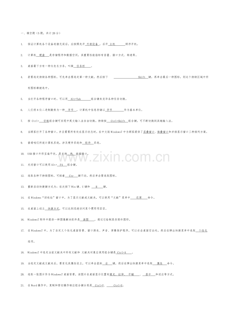 21. 在Word操作中,复制和剪切操作相应组合键分别是 Ctrl+V、 Ctrl+X。