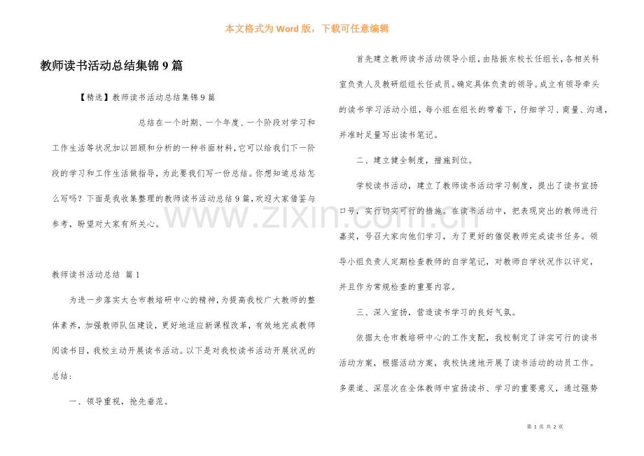 总结在一个时期、一个年度、一个阶段对学习和工作生活等状况加以回顾和分析的一种书面材料,它可以给我们下一阶段的学习和工作生活做指导,为此要我们写一份总结。你想知道总结怎么写吗?下面是我收集整理的教师读书活动总结9篇,欢迎大家借鉴与参考,盼望对大家有所关心。