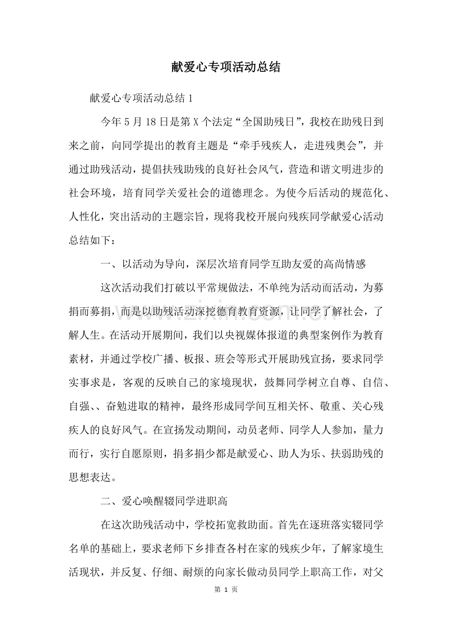 今年5月18日是第X个法定“全国助残日”,我校在助残日到来之前,向同学提出的教育主题是“牵手残疾人,走进残奥会”,并通过助残活动,提倡扶残助残的良好社会风气,营造和谐文明进步的社会环境,培育同学关爱社会的道德理念。为使今后活动的规范化、人性化,突出活动的主题宗旨,现将我校开展向残疾同学献爱心活动总结如下:
