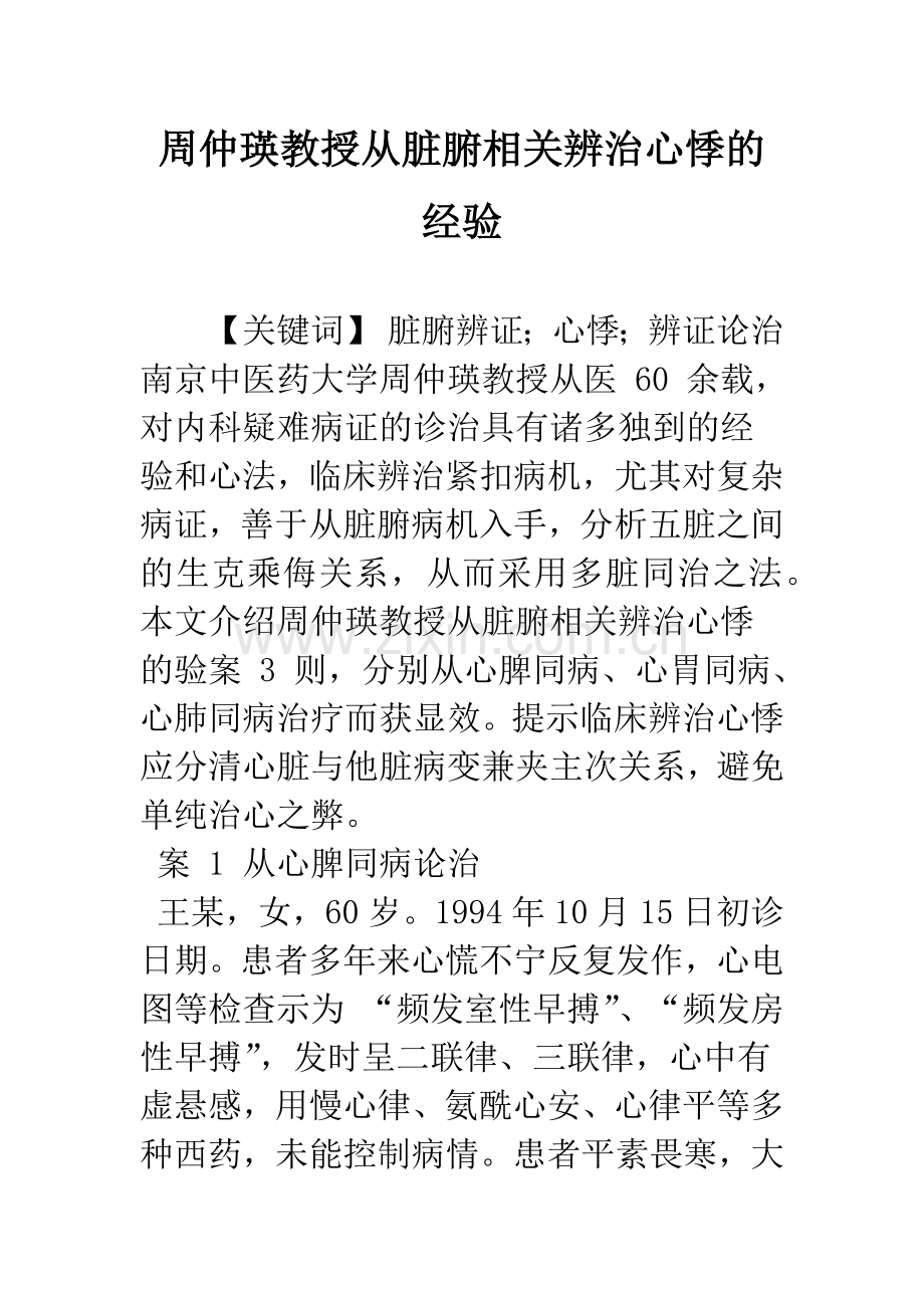 南京中医药大学周仲瑛教授从医 60 余载,对内科疑难病证的诊治具有诸多独到的经验和心法,临床辨治紧扣病机,尤其对复杂病证,善于从脏腑病机入手,分析五脏之间的生克乘侮关系,从而采用多脏同治之法。本文介绍周仲瑛教授从脏腑相关辨治心悸的验案 3 则,分别从心脾同病、心胃同病、心肺同病治疗而获显效。提示临床辨治心悸应分清心脏与他脏病变兼夹主次关系,避免单纯治心之弊。