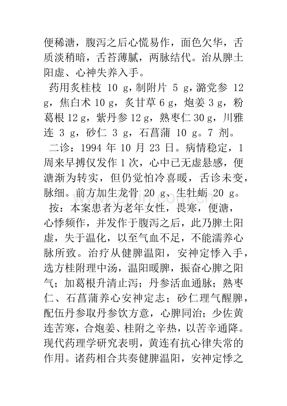 王某,女,60 岁。1994 年 10 月 15 日初诊日期。患者多年来心慌不宁反复发作,心电图等检查示为 “频发室性早搏”、“频发房性早搏”,发时呈二联律、三联律,心中有虚悬感,用慢心律、氨酰心安、心律平等多种西药,未能控制病情。患者平素畏寒,大便稀溏,腹泻之后心慌易作,面色欠华,舌质淡稍暗,舌苔薄腻,两脉结代。治从脾土阳虚、心神失养入手。
