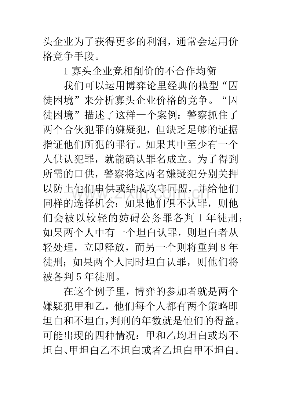 囚徒困境可以用来分析寡头企业的价格战,由于在寡头市场上只有为数很少的几家厂商,每个厂商的行为对市场的影响都是举足轻重的,厂商为了获得更大的市场份额,往往会采取降低价格的竞争手段。但是某一个厂商首先采取降价的竞争手段后,其他厂商也会采取相应的降价手段作为回应和报复,以保住甚至扩大自己的市场份额。于是在经过寡头厂商轮番降价后,市场的价格会降到一个很低的水平,其结果往往是两败俱伤。