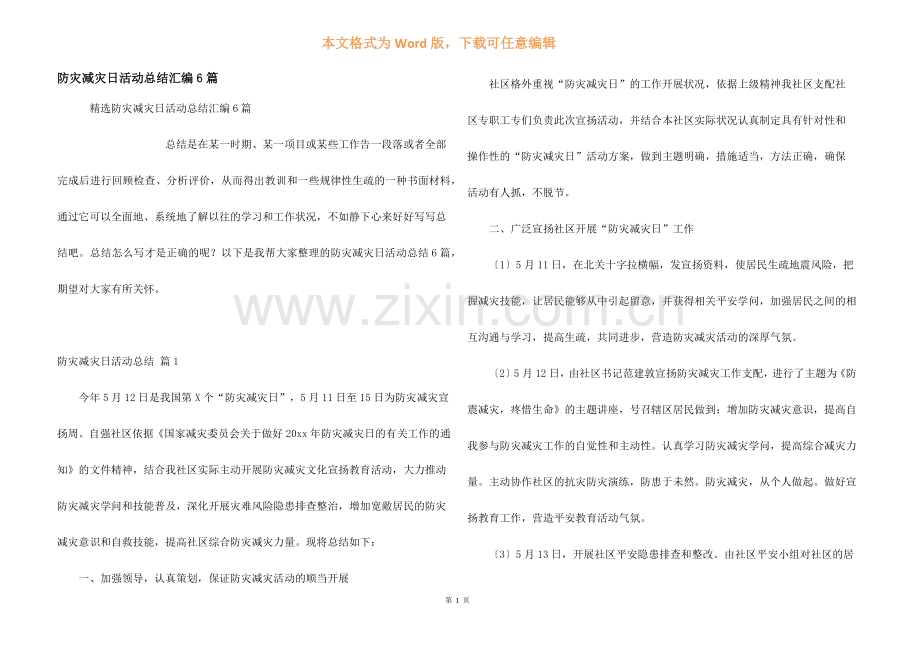 总结是在某一时期、某一项目或某些工作告一段落或者全部完成后进行回顾检查、分析评价,从而得出教训和一些规律性生疏的一种书面材料,通过它可以全面地、系统地了解以往的学习和工作状况,不如静下心来好好写写总结吧。总结怎么写才是正确的呢?以下是我帮大家整理的防灾减灾日活动总结6篇,期望对大家有所关怀。