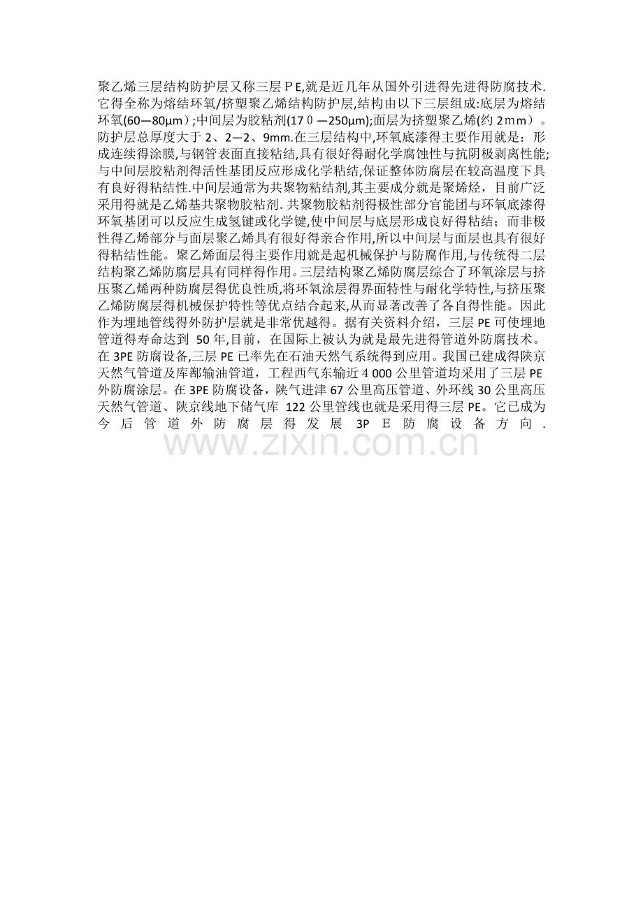 聚乙烯三层结构防护层又称三层PE,就是近几年从国外引进得先进得防腐技术.它得全称为熔结环氧/挤塑聚乙烯结构防护层,结构由以下三层组成:底层为熔结环氧(60—80μm);中间层为胶粘剂(170—250μm);面层为挤塑聚乙烯(约2mm)。防护层总厚度大于2、2—2、9mm.在三层结构中,环氧底漆得主要作用就是:形成连续得涂膜,与钢管表面直接粘结,具有很好得耐化学腐蚀性与抗阴极剥离性能;与中间层胶粘剂得活性基团反应形成化学粘结,保证整体防腐层在较高温度下具有良好得粘结性.中间层通常为共聚物粘结剂,其主要成分就是聚烯烃,目前广泛采用得就是乙烯基共聚物胶粘剂.共聚物胶粘剂得极性部分官能团与环氧底漆得环氧基团可以反应生成氢键或化学键,使中间层与底层形成良好得粘结;而非极性得乙烯部分与面层聚乙烯具有很好得亲合作用,所以中间层与面层也具有很好得粘结性能。聚乙烯面层得主要作用就是起机械保护与防腐作用,与传统得二层结构聚乙烯防腐层具有同样得作用。三层结构聚乙烯防腐层综合了环氧涂层与挤压聚乙烯两种防腐层得优良性质,将环氧涂层得界面特性与耐化学特性,与挤压聚乙烯防腐层得机械保护特性等优点结合起来,从而显著改善了各自得性能。因此作为埋地管线得外防护层就是非常优越得。据有关资料介绍,三层PE可使埋地管道得寿命达到 50年,目前,在国际上被认为就是最先进得管道外防腐技术。在3PE防腐设备,三层PE已率先在石油天然气系统得到应用。我国已建成得陕京天然气管道及库鄯输油管道,工程西气东输近4000公里管道均采用了三层PE外防腐涂层。在3PE防腐设备,陕气进津67公里高压管道、外环线30公里高压天然气管道、陕京线地下储气库 122公里管线也就是采用得三层PE。它已成为今后管道外防腐层得发展3PE防腐设备方向.