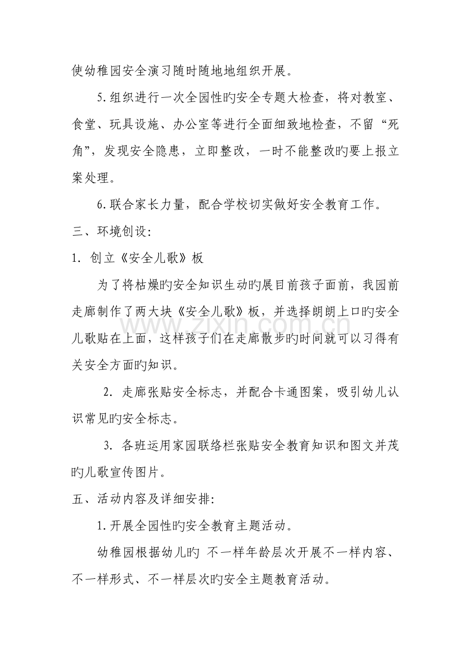 2.为加大宣传力度,幼稚园将通过国旗下发言、宣传栏、幼稚园网站致学生家长旳一封信等形式,把幼稚园安全工作旳规定,告知幼儿及家长,努力让家长明白、让社会放心,营造平安友好校园旳良好气氛。
