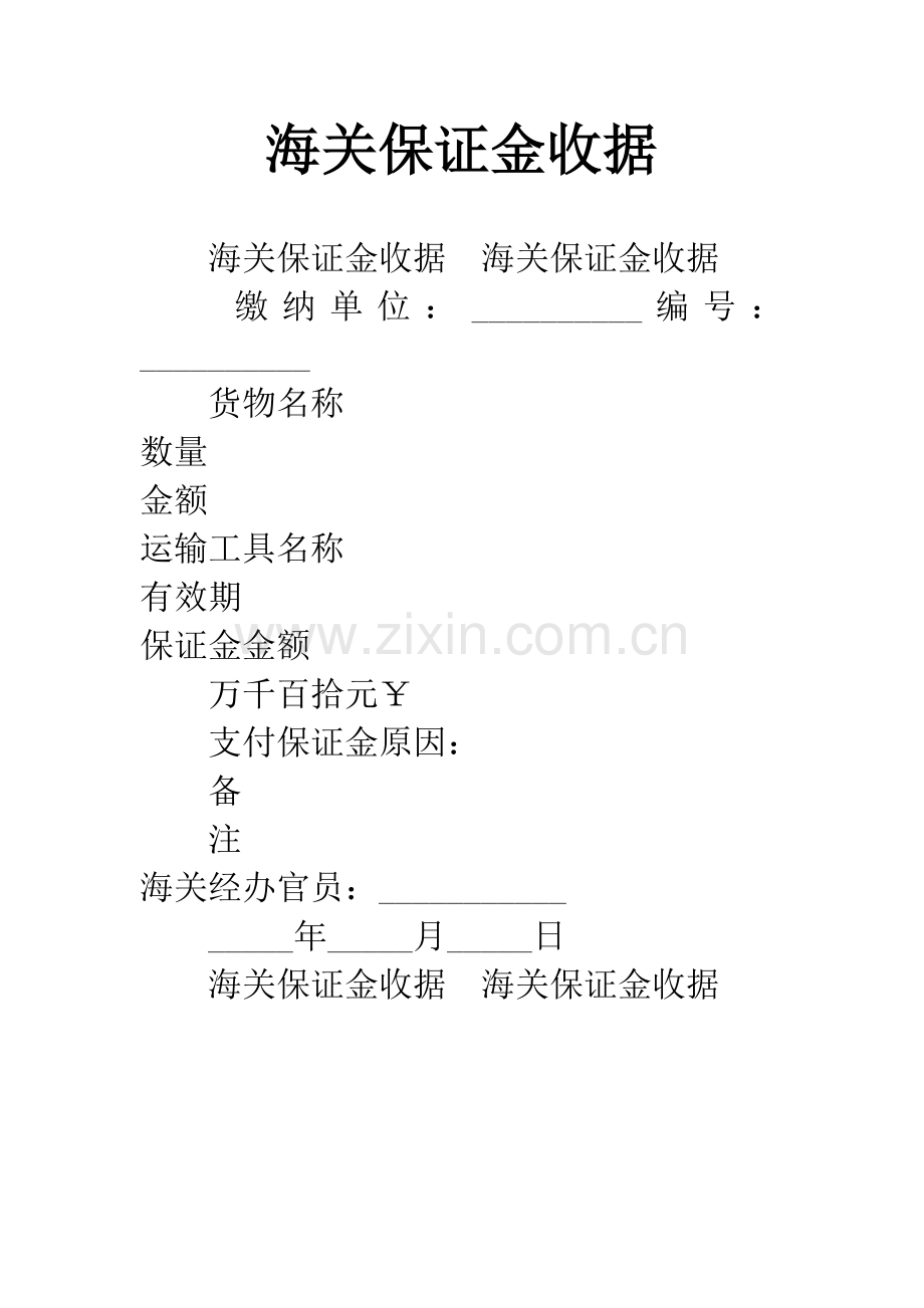 海关保证金收据   海关保证金收据 海关保证金收据   缴纳单位:__________编号:__________   货物名称 数量 金额 运输工具名称 有效期 保证金金额   万千百拾元¥   支付保证金原因:   备   注 海关经办官员:___________   _____年_____月_____日   海关保证金收据 海关保证金收据