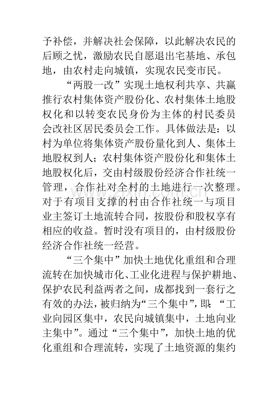 “三个集中”加快土地优化重组和合理流转在加快城市化、工业化进程与保护耕地、保护农民利益两者之间,成都找到一套行之有效的办法,被归纳为“三个集中”,即:“工业向园区集中,农民向城镇集中,土地向业主集中”。通过“三个集中”,加快土地的优化重组和合理流转,实现了土地资源的集约利用、农民经济生活空间的转移。