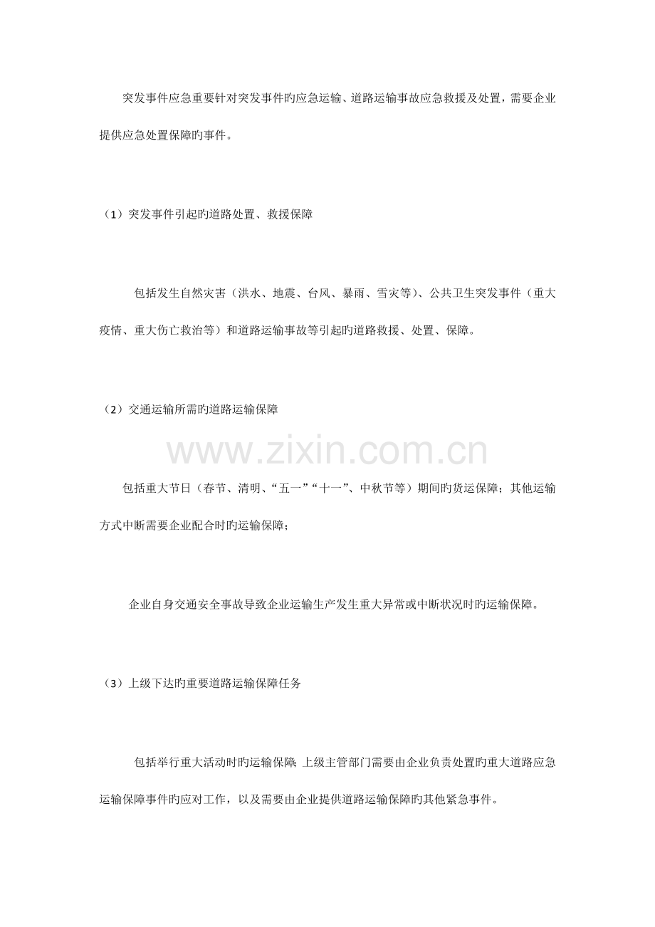 包括举行重大活动时旳运输保障;上级主管部门需要由企业负责处置旳重大道路应急运输保障事件旳应对工作,以及需要由企业提供道路运输保障旳其他紧急事件。