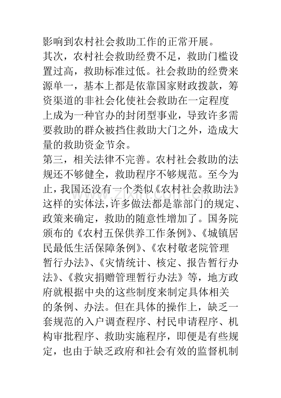 第三,相关法律不完善。农村社会救助的法规还不够健全,救助程序不够规范。至今为止,我国还没有一个类似《农村社会救助法》这样的实体法,许多做法都是靠部门的规定、政策来确定,救助的随意性增加了。国务院颁布的《农村五保供养工作条例》、《城镇居民最低生活保障条例》、《农村敬老院管理暂行办法》、《灾情统计、核定、报告暂行办法》、《救灾捐赠管理暂行办法》等,地方政府就根据中央的这些制度来制定具体相关的条例、办法。但在具体的操作上,缺乏一套规范的入户调查程序、村民申请程序、机构审批程序、救助实施程序,即便是有些规定,也由于缺乏政府和社会有效的监督机制而难以落实。