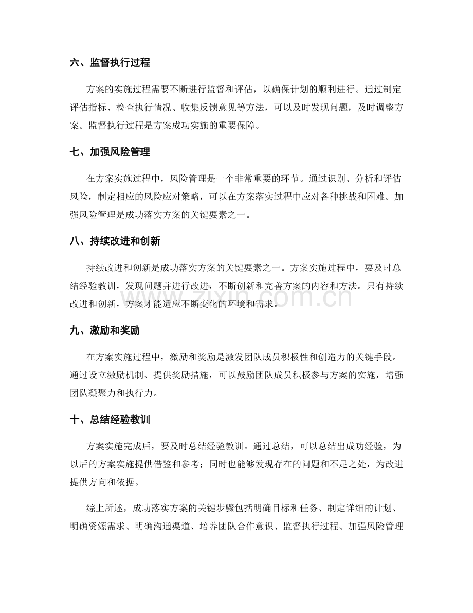 综上所述,成功落实方案的关键步骤包括明确目标和任务、制定详细的计划、明确资源需求、明确沟通渠道、培养团队合作意识、监督执行过程、加强风险管理、持续改进和创新、激励和奖励以及总结经验教训。这些要素是相互关联、相互促进的,只有各个要素一起发挥作用,方案才能成功实施,取得预期效果。