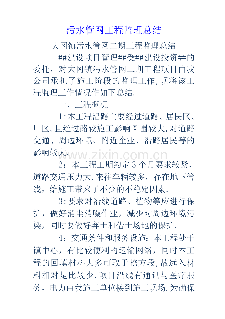 大冈镇污水管网二期工程监理总结