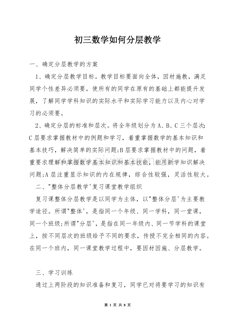 总之,以"扶'为主,"扶'中有"放',重在带领同学学习。关于一层的同学在教学中注意启发同学思索探究,体会基础知识、基本方法,并归纳出一般的规律与结论,再引导同学变更问题帮助同学进行变式探求。对一层同学以"放'为主,"放'中有"扶'。特别教师的导,贵在指导,重在转化,妙在开窍。培养同学的独立思索和自学能力进而向革新精神和创造能力发展。平常的课堂中我们的授课形式是多样的。全体参加的课占主导,既要让不同层次的同学得到发展又不能让A层同学知识有人为的断层。复式课的授课是一个补充。不同层次的同学学习同时学习不同层次的学习,评讲与学习交错进行。既不浪费时间又可各取所必须,一举三得。这种形式在复习巩固课和初三的二、三轮复习中我们常用。老师讲综合题能掌握的人不多,但几个问题又有不同的层次,同学能听做到那一层就到哪一层,讲下面的你就复习基础题。充分发挥了45分钟的效益。