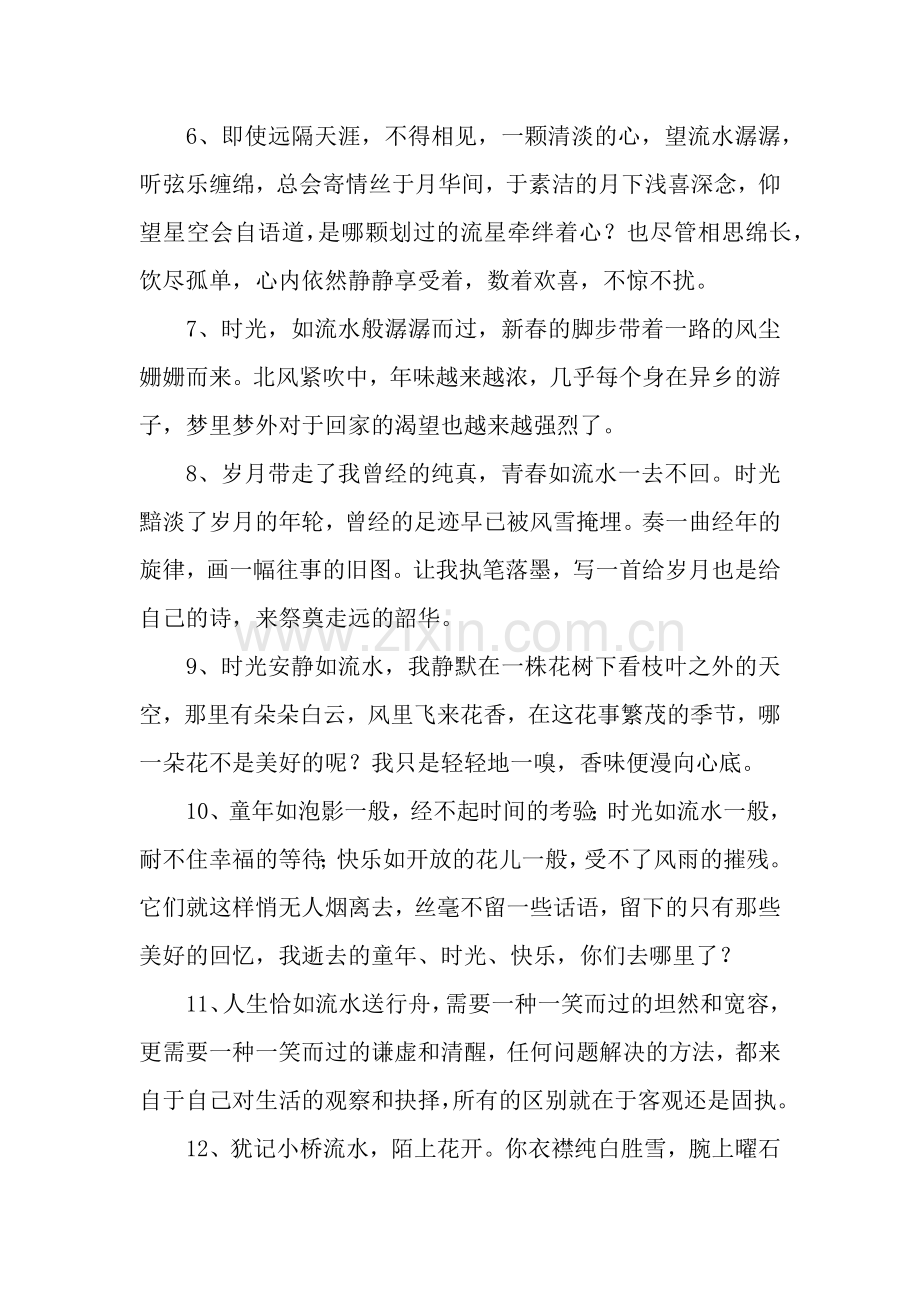 15、时光如流水,带着青春的梦缓缓流过,也带着岁月的体会和感受。水边的树木都在一分一秒中变换着春天的颜色。就像这在一分一秒中流逝的青春时光。如果今生只能实现一个愿望,我愿在这每时每刻里,你美丽如水的青春流淌在我心间。让这世间最美丽的风景,伴我天涯每天。