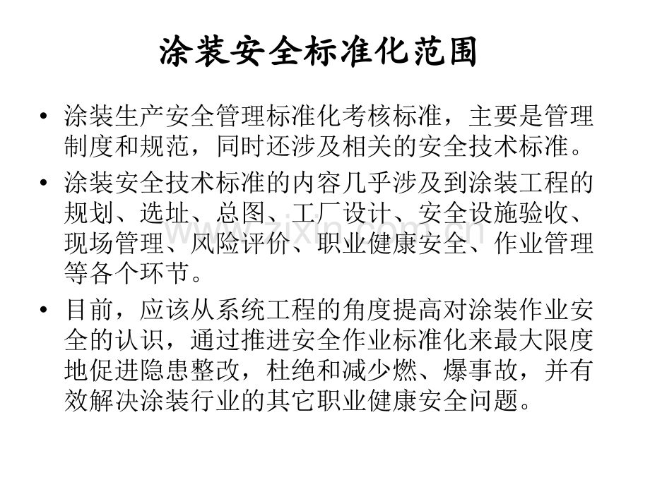 一一、涂装安全生产标准体系涂装安全生产标准体系1.1.涂装安全标准化范围涂装安全标准化范围2.2.涂装安全标准类型涂装安全标准类型3.3.涂装作业安全标准体系涂装作业安全标准体系4.4.涂装生产安全标准化发展涂装生产安全标准化发展 涂装安全标准化范围涂装安全标准化范围涂装生产安全管理标准化考核标准,主要是管理制度和规范,同时还涉及相关的安全技术标准。涂装安全技术标准的内容几乎涉及到涂装工程的规划、选址、总图、工厂设计、安全设施验收、现场管理、风险评价、职业健康安全、作业管理等各个环节。目前,应该从系统工程的角度提高对涂装作业安全的认识,通过推进安全作业标准化来最大限度地促进隐患整改,杜绝和减少燃、爆事故,并有效解决涂装行业的其它职业健康安全问题。涂装安全标准类型涂装安全标准类型 在涂装安全生产领域,相关的涂装安全标准已经形成了基本的体系框架。涂装安全标准体系包括强制性和推荐性的国家涂装作业安全标准系列、安全生产领域行业标准以及相关的其他安全技术标准系列等等。其中,有关涂装安全作业的国家标准,目前主要指涂装作业安全规程的系列标准。其中绝大多数是强制性执行标准。包括涂漆工艺安全及其通风净化涂漆前处理工艺安全涂层烘干室安全技术规定等十多项。涂装作业安全标准体系涂装作业安全标准体系 涂装作业已经有了相对系统的国家涂装作业安全系列标准。其中包括GBT14441“术语”、GB7691“劳动安全和劳动卫生管理”,GB7692“涂漆前处理工艺安全及其通风净化”,GB6514“涂漆工艺安全及其通风净化”,GBl2367“静电喷漆工艺安全”,GBl5607“粉末静电喷涂工艺安全”,GBl4444“喷漆室安全技术规定”,GBl4443“涂层烘干室安全技术规定”,GBl4773“静电喷枪及其辅助装置安全技术条件”,GB12942“有限空间作业安全技术要求”GB 17750“浸涂工艺安全”等国家标准和涂装工程安全技术相关的技术规范,也包括AQ5201“涂装工程安全设施验收规范”等行业标准,对工艺设计、设备制造、生产作业,都比较明确地提出了安全要求。涂装生产安全标准化涂装生产安全标准化 从上世纪从上世纪80 80 年代,为了更加有效地解决关于涂装作业年代,为了更加有效地解决关于涂装作业安全卫生问题,政府非常重视安全生产的监管,要求涂装安全卫生问题,政府非常重视安全生产的监管,要求涂装生产企业管理实施安全标准化。近年来,每年都有相关行生产企业管理实施安全标准化。近年来,每年都有相关行业标准颁布。接着是在相关行业加强标准化管理意识,通业标准颁布。接着是在相关行业加强标准化管理意识,通过积极进行标准宣贯,主要实现的目标:过积极进行标准宣贯,主要实现的目标:1.1.涂装设备与国际接轨,建立安全质量准入制度,实施涂涂装设备与国际接轨,建立安全质量准入制度,实施涂装设施安全质量第三方检验;装设施安全质量第三方检验;2.2.完善涂装职业健康安全的行政监督制度,实施涂装设备、完善涂装职业健康安全的行政监督制度,实施涂装设备、设施的安全认可,执行涂装建设项目(工程)安全设施验设施的安全认可,执行涂装建设项目(工程)安全设施验收制度;收制度;3.3.促进涂装企业安全管理实施安全生产标准化体系。促进涂装企业安全管理实施安全生产标准化体系。涂装生产管理的安全标准化涂装生产管理的安全标准化 根据不断颁布的法令和技术规范,涂根据不断颁布的法令和技术规范,涂装生产企业及其涂装作业的职业安全健康装生产企业及其涂装作业的职业安全健康管理体系建设需要有更大的改观。负责安管理体系建设需要有更大的改观。负责安全生产综合监督管理的国家安全生产监督全生产综合监督管理的国家安全生产监督管理部门正在督促机械行业推广涂装作业管理部门正在督促机械行业推广涂装作业管理的安全生产标准化管理体系建设和评管理的安全生产标准化管理体系建设和评级考核工作。级考核工作。二、涂装作业管理安全标准化1.1.涂装作业现场安全管理涂装作业现场安全管理2.2.涂装设备的安全管理涂装设备的安全管理3.3.安全管理标准化的基础安全管理标准化的基础4.4.生产运行管理的安全标准化生产运行管理的安全标准化涂装作业现场安全管理涂装作业现场安全管理基本要求而言,涂装作业现场安全管理,就是提高工艺设备的本质安全度,预防生产安全事故,控制职业危害,防止作业人员发生职业健康问题。实施有效的职业安全健康管理,最有效的方法之一是坚持标准化管理的方向。根据目前大力推行的生产安全管理标准化要求。涂装生产安全管理标准化考核主要涉及的标准除了管理内容的制度和规范外,还涉及相关的安全技术标准。由于安全标准化是高要求的实现,实施起来不可能一步到位,应该是一个持续改进的过程。工艺安全性改进 涂装企业应积极改进涂装工艺,并重视工艺的安全性改进。淘汰和替换那些危害性较大的旧工艺,诸如火焰法除旧漆工艺;苯类溶剂前处理工艺;以及用甲苯、二甲苯和汽油进行大面积除油和除旧漆的工艺、干喷砂除锈工艺等,向有利于作业人员安全健康的方向发展。对涂料的使用进行评价和革新。诸如限制含红丹涂料的使用等,对含苯的涂料、稀释剂和溶剂;含苯、汞、砷、铅、镉、锑和铬