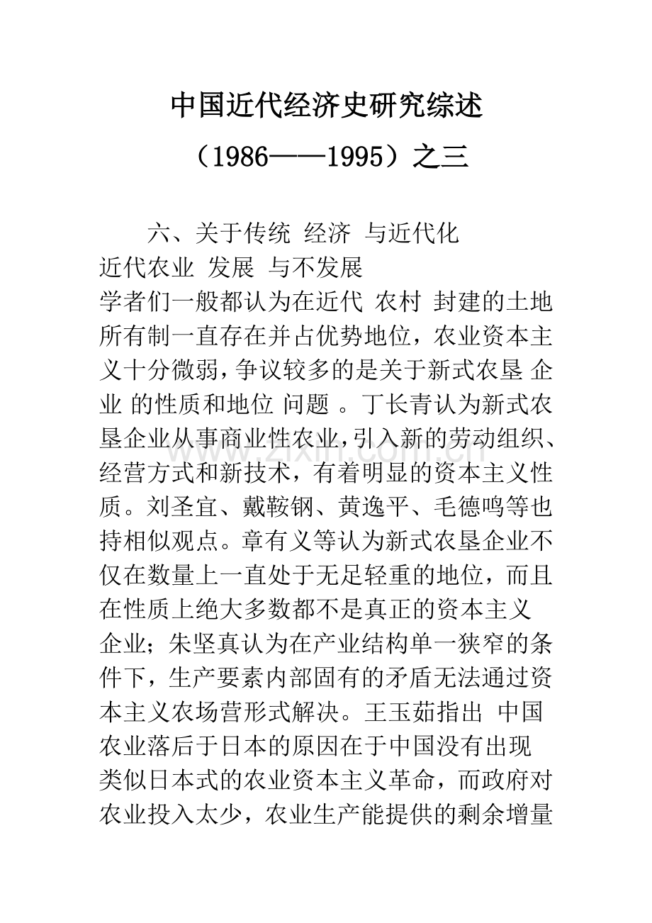 学者们一般都认为在近代 农村 封建的土地所有制一直存在并占优势地位,农业资本主义十分微弱,争议较多的是关于新式农垦 企业 的性质和地位 问题 。丁长青认为新式农垦企业从事商业性农业,引入新的劳动组织、经营方式和新技术,有着明显的资本主义性质。刘圣宜、戴鞍钢、黄逸平、毛德鸣等也持相似观点。章有义等认为新式农垦企业不仅在数量上一直处于无足轻重的地位,而且在性质上绝大多数都不是真正的资本主义企业;朱坚真认为在产业结构单一狭窄的条件下,生产要素内部固有的矛盾无法通过资本主义农场营形式解决。王玉茹指出 中国 农业落后于日本的原因在于中国没有出现类似日本式的农业资本主义革命,而政府对农业投入太少,农业生产能提供的剩余增量也很少。关于近代经营地主的情况,刘克祥作了较为详细的 研究 ,他 分析 了经营地主的经营方式和规模、资本构成及运营等,认为近代经营地主是具有某种资本主义性质的地主经济,由于近代中国城乡资本主义是建立在不断下降的 社会 生产力和劳动生产率基础上的,这就从根本上堵塞了经营地主向资本主义农业企业演变的道路。《中国资本主义发展史》第三卷考察了近代农业中经营地主、富农经济、农业公司和农场这三种形式后指出:经营地主的优越性在于规模经营,但在多数情况下经营地主并不比出租土地、个体生产能获得更高的产量,这除了是由于地主不善经营外,还因为中国集约化的小农经济有不可低估的生产效率,而规模经济在这种集约农业中并非重要因素;富农经营的主要优越性在于劳动力,富农以家工带领雇工,是传统农业条件下最有效率的劳动力组织。但富农经济极不稳定,其作用不大;农业公司和农场的主要作用在于把股份集资制度入农业,并部分地引入了新式生产工具和 科学 技术,在垦荒和提高土地利用效益上有所贡献,但因其数量很小,在整个农业中作用微乎其微。这些关于不同经营形式生产力状况的分析,对我们今后的进一步研究颇有启示意义。[43]