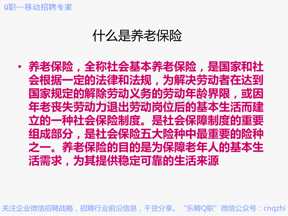 1Q职职移动招聘专家移动招聘专家什么是养老保险养老保险,全称社会基本养老保险,是国家和社会根据一定的法律和法规,为解决劳动者在达到国家规定的解除劳动义务的劳动年龄界限,或因年老丧失劳动力退出劳动岗位后的基本生活而建立的一种社会保险制度。是社会保障制度的重要组成部分,是社会保险五大险种中最重要的险种之一。养老保险的目的是为保障老年人的基本生活需求,为其提供稳定可靠的生活来源 3养老保险:养老保险:一一 般般 要交满要交满15年,到退休的时候才能终生享受养老年,到退休的时候才能终生享受养老金金,所以想拿养老金的人请务必在自己退休前所以想拿养老金的人请务必在自己退休前15年就开年就开始交。如果到退休年龄交养老保险不满始交。如果到退休年龄交养老保险不满15年年,那等到你那等到你退休的时候国家会把你个人帐户上存的退休的时候国家会把你个人帐户上存的8%的养老金全的养老金全部退给你。那单位给你交的部退给你。那单位给你交的20%到哪里去了到哪里去了?国家把单国家把单位为你交的位为你交的20%的钱全部划到国家的养老统筹基金里了。的钱全部划到国家的养老统筹基金里了。国家规定,退钱的时候只退给个人自己扣交的钱国家规定,退钱的时候只退给个人自己扣交的钱,单位单位为他交的钱全部都为国家做贡献。为他交的钱全部都为国家做贡献。请用请用 告诉我什么是养老保险告诉我什么是养老保险4基本常识一、我的钱花在哪里了,公司给我交了多少 社保的交费比例1养老保险金单位20%,个人8%;2医疗保险金单位7.5%+2.5,个人交2%+2.5大病统筹;3失业保险金单位2%,个人1%;4工伤保险金单位0.5%;5生育保险金单位0.6%。5个人与单位分别承担的比例2014年7月开始执行,从2014.4月补扣原来个人共扣243.2元,6月份基本工资扣278.5元67一、养老保险的退休条件养老保险缴费年限(含视同缴费年限)不少于15 年,退休前有断档需补齐。达到国家规定法定退休年龄(男年满60周岁,女工人年满50周岁、女干部年满55周岁)。注:以上条件缺一不可。8二、养老保险的个人续接 本人到工商银行开具个人结算户存折,持身份证原件、户口原件、单位养老保险封存单到户口所在区社保局办理接续手续。9养老保险跟退休前一年当地的社平工资,交费基数,交费时间有关系。养老金=基础养老金+个人账户额举个例子:本人今年30岁,即从30岁开始交的保险,交到55岁退休,交了25年,完全可以领到养老金。假如在我54岁那年社会平均工资是5000,那么可以基础养老金5000*30%=1500元。30岁时的资费基数为2000元,55岁时交费基数是5000,平均基数为(2000+5000)/2=3500元,那么25年个人账户上应该有3500*8%*25*12=84000元。除了之前的1500元,个人还能拿到84000/120=700元。即养老金为2300元。当然,国家的基数每年都在往上涨,除了自己拿的700元,每年都会拿到比1000元高的基础养老金,注:满15年,在20%基础上每增加1年多1个百分点。三、退休后我能领到多少 呢?1011用人单位和个人缴纳的基本医疗保险费,划分为医疗保险统筹金和个人账户两部分。即我们所说的大病统筹和个人医保卡。个人账户支付范围:(一)在定点医疗机构门诊发生的费用;(二)在定点药店购药的费用;(三)在定点医疗机构住院治疗应当由个人负担的费用。12 如果生大病需要住院治疗,好办,只要把卡交给医院,就可以安心治疗了。卡里面一分钱没有也没关系。出院时医院会和医保中心结算,个人只需负担三分之一的费用。Q职 移动招聘专家!关注企业微信招聘战略,招聘行业前沿信息,干货分享。“乐聘Q职”微信公众号:cnqzhi13哪种情况不能在医院报销呢?1415连续缴费12个月以上非本人意愿中断就业16连续缴费一年领取3个月的失业金,最长不超过24个月目前哈市失业金标准:735元/月注:失业金可以跨地区领取,需按照户口所在地标准领取。1718一、什么是工伤保险?一、什么是工伤保险?劳动者在工作中或在规定的特殊情况下,遭受意外伤害或患职业病导致暂时或永久丧失劳动能力以及死亡时,劳动者或其遗属从国家和社会获得物质帮助的一种社会保险制度。19工伤的认定范围?工伤的认定范围?职工有下列情形之一的,应当认定为工伤:职工有下列情形之一的,应当认定为工伤:2021 哈尔滨市第一、二、三(二四二)、四、五医院、哈尔滨市骨伤科医院、哈尔滨市中医医院、黑龙江省医院、呼兰区中医医院、阿城区人民医院、爱尔眼科医院、省二院(职业病)2223劳动能力等级鉴定劳动能力等级鉴定 职工发生工伤,经治疗伤情相对稳定后存在残疾、影响劳动能力的,应当进行劳动能力鉴定。劳动能力鉴定是指劳动功能障碍程度和生活自理障碍程度的等级鉴定。劳动功能障碍分为十个伤残等级,最重的为一级,最轻的为十级。生活自理障碍分为三个等级:生活完全不能自理、生活大部分不能自理和生活部分不能自理。注:劳动能力等级鉴定在哈尔滨市中医医院。24 生育保险报销流程,是指用人单位及职工本人就生育保险报销流程,是指用人单位及职工本人就女职工在生育期间的生育医疗费、生育津贴等费用,女职工在生育期间的生育医疗费、生育津贴等费用,男职工在配偶生育期间的看护假假期津贴向统筹地区男职工在配偶生育期间的看护假假期津贴向统筹地区生育保险基金报销的程序。生育保险基金报销的程序。25内容