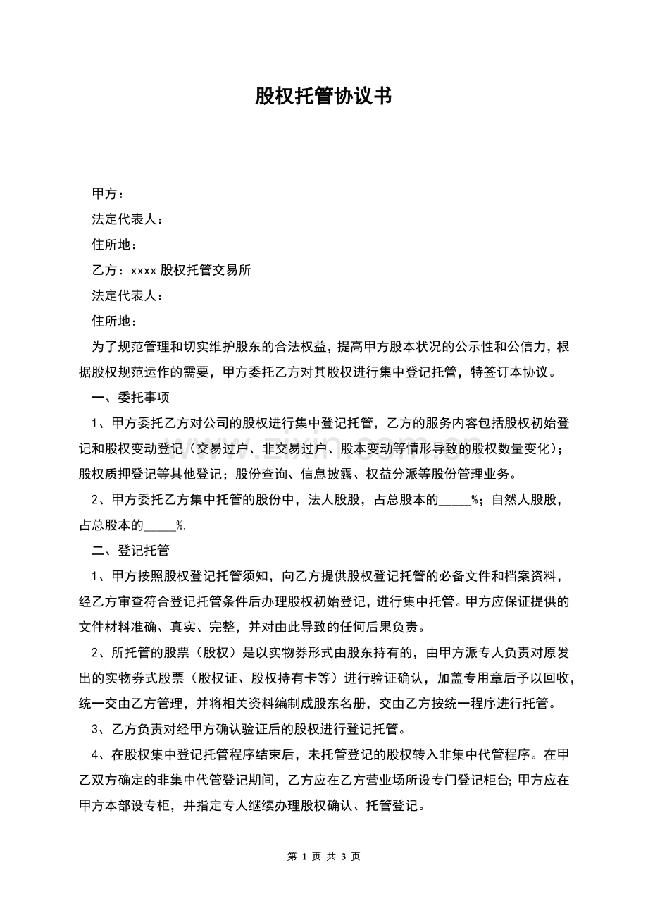 为了规范管理和切实维护股东的合法权益,提高甲方股本状况的公示性和公信力,根据股权规范运作的需要,甲方委托乙方对其股权进行集中登记托管,特签订本协议。