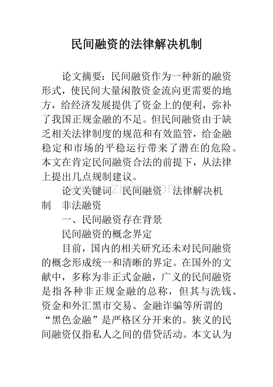论文关键词 民间融资 法律解决机制 非法融资