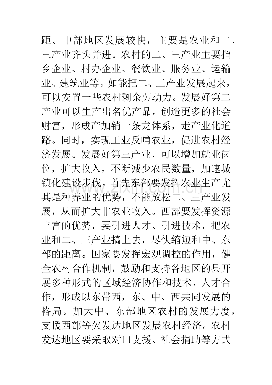 1.发挥各自优势,尽量缩小区域间的差距。中部地区发展较快,主要是农业和二、三产业齐头并进。农村的二、三产业主要指乡企业、村办企业、餐饮业、服务业、运输业、建筑业等。如能把二、三产业发展起来,可以安置一些农村剩余劳动力。发展好第二产业可以生产出名优产品,创造更多的社会财富,形成产加销一条龙体系,走产业化道路。同时,实现工业反哺农业,促进农村经济发展。发展好第三产业,可以增加就业岗位,扩大收入,不断减少农民数量,加速城镇化建设步伐。首先东部要发挥农业生产尤其是种养业的优势,不能放松二、三产业发展,从而扩大非农业收入。西部要发挥资源丰富的优势,要引进人才、引进技术,把农业和二、三产业搞上去,尽快缩短和中、东部的距离。国家要发挥宏观调控的作用,健全农村合作机制,鼓励和支持各地区的县开展多种形式的区域经济协作和技术、人才合作,形成以东带西,东、中、西共同发展的格局。加大中、东部地区农村的发展力度,支援西部等欠发达地区发展农村经济。农村发达地区要采取对口支援、社会捐助等方式帮扶农村欠发达地区。