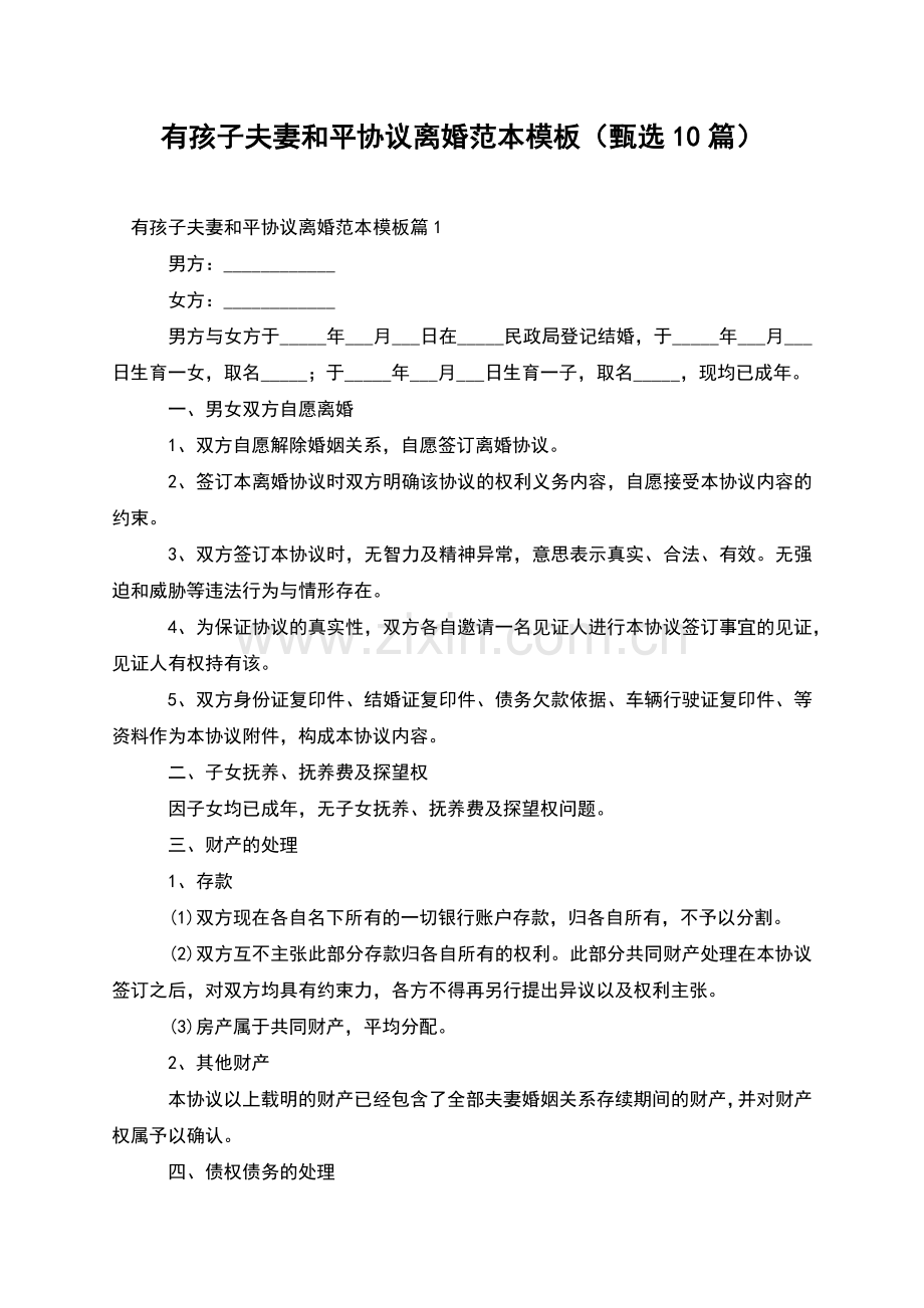 有孩子夫妻和平协议离婚范本模板(甄选10篇)
