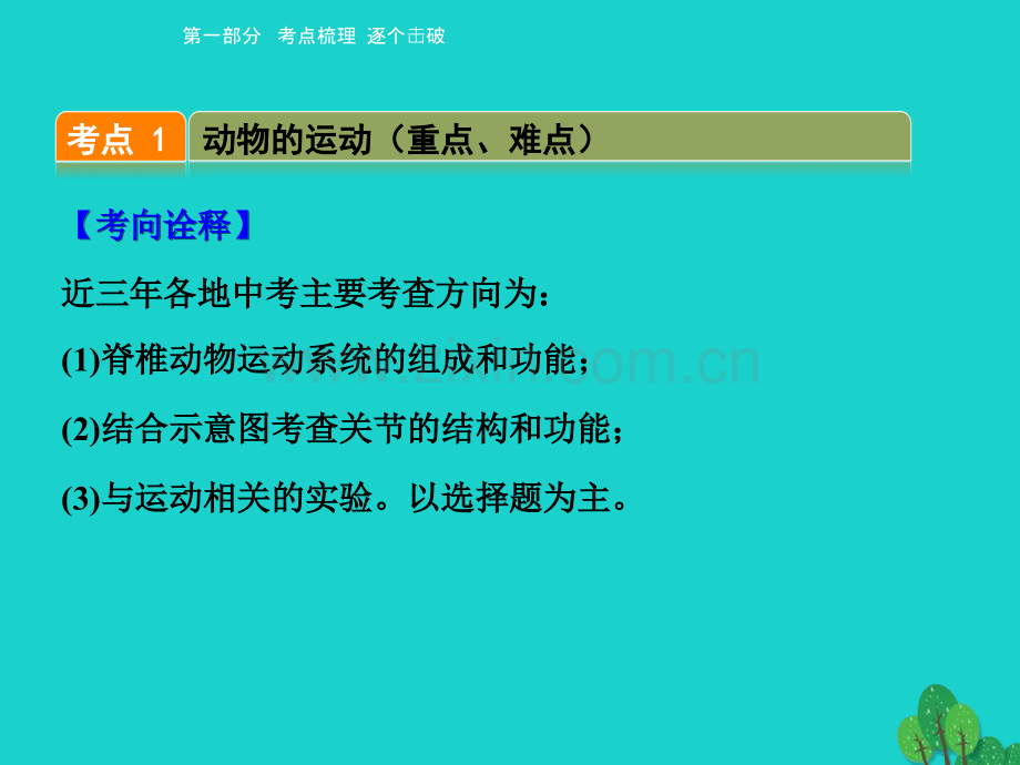 第第 二二 章章章章 动物的运动和行为动物的运动和行为考点考点 1 动物的运动(重点、难点)动物的运动(重点、难点)考点考点 2 动物的行为(重点、难点)动物的行为(重点、难点)【考向诠释考向诠释考向诠释考向诠释】近三年各地中考主要考查方向为:近三年各地中考主要考查方向为:(1)脊椎动物运动系统的组成和功能;脊椎动物运动系统的组成和功能;(2)结合示意图考查关节的结构和功能;结合示意图考查关节的结构和功能;(3)与运动相关的实验。以选择题为主。与运动相关的实验。以选择题为主。考点考点 1 1 动物的运动(重点、难点)动物的运动(重点、难点)第一部分 考点梳理逐个击破【考点攻略考点攻略考点攻略考点攻略】1运动系统运动系统(1)运动系统的组成及作用:运动系统的组成及作用:骨骨杠杆杠杆;关节;关节支点支点;骨骼肌;骨骼肌动力动力。(2)关节的结构和功能关节的结构和功能考点考点 1 1 动物的运动(重点、难点)动物的运动(重点、难点)第一部分 考点梳理逐个击破名称名称结构结构功能功能关节面关节面由由关节头关节头和和关节关节窝窝构成,关节面构成,关节面上覆盖一层光滑上覆盖一层光滑的的关节软骨关节软骨关节软骨可减少关节软骨可减少运动时的摩擦;运动时的摩擦;还具有弹性,可还具有弹性,可以缓冲运动时的以缓冲运动时的震动和冲击震动和冲击 使关节牢固的结构:使关节牢固的结构:关节囊关节囊及关节囊里、外的及关节囊里、外的韧带韧带。使关节灵活的结构:使关节灵活的结构:关节软骨关节软骨和关节腔里面的和关节腔里面的滑液滑液。(3)骨骼和骨骼肌:骨与骨之间通过关节等方式相连形成骨骼和骨骼肌:骨与骨之间通过关节等方式相连形成 骨骼,附着在骨骼上的肌肉称为骨骼肌。骨骼肌由骨骼,附着在骨骼上的肌肉称为骨骼肌。骨骼肌由肌肌 腹腹和和肌腱肌腱组成。组成。考点考点 1 1 动物的运动(重点、难点)动物的运动(重点、难点)第一部分 考点梳理逐个击破关节囊关节囊由结缔组织构成,由结缔组织构成,围绕整个关节,里围绕整个关节,里面和外面都有坚韧面和外面都有坚韧的的韧带韧带结缔组织和韧带可以把结缔组织和韧带可以把两骨牢固地连接,囊壁两骨牢固地连接,囊壁内表面能分泌内表面能分泌滑液滑液关节腔关节腔由关节面和关节囊由关节面和关节囊共同围成的空腔,共同围成的空腔,内含少量滑液内含少量滑液滑液有减少骨与骨之间滑液有减少骨与骨之间摩擦的作用,使关节活摩擦的作用,使关节活动灵活自如动灵活自如续表续表2运动运动(1)条件:神经系统的调控;呼吸系统、消化系统、循环条件:神经系统的调控;呼吸系统、消化系统、循环 系统等系统的配合;骨、关节、肌肉协调配合。系统等系统的配合;骨、关节、肌肉协调配合。(2)运动的产生:神经系统支配运动的产生:神经系统支配骨骼肌收缩骨骼肌收缩牵引骨绕牵引骨绕 关节活动。关节活动。(3)动物运动的意义:有利于动物的觅食和避敌,适应复动物运动的意义:有利于动物的觅食和避敌,适应复 杂的环境。杂的环境。考点考点 1 1 动物的运动(重点、难点)动物的运动(重点、难点)第一部分 考点梳理逐个击破3两组或多组肌肉相互配合完成动作两组或多组肌肉相互配合完成动作考点考点 1 1 动物的运动(重点、难点)动物的运动(重点、难点)第一部分 考点梳理逐个击破屈肘屈肘伸肘伸肘直臂提直臂提重物重物两臂两臂自自然下垂然下垂肱二头肌肱二头肌收缩收缩舒张舒张收缩收缩舒张舒张肱三头肌肱三头肌舒张舒张收缩收缩收缩收缩舒张舒张动动作作状态状态肌肉肌肉考点考点 1 1 动物的运动(重点、难点)动物的运动(重点、难点)第一部分 考点梳理逐个击破思路点拨思路点拨C屈肘时屈肘时2肱二头肌收缩,肱二头肌收缩,1肱三头肌舒张;图中肱三头肌舒张;图中3是肌腹,是肌腹,4是肌腱;是肌腱;听到口令做屈肘动作是通过神经系统和运动系统等配合完成的。听到口令做屈肘动作是通过神经系统和运动系统等配合完成的。【典例典例典例典例 1 1】2015,泰安,泰安下下图为人图为人的屈肘动作和伸肘的屈肘动作和伸肘动作动作 示意图示意图,与此有关的叙述正确的是,与此有关的叙述正确的是()A.屈肘时,屈肘时,1肱二头肌舒张,肱二头肌舒张,2肱三头肌收缩肱三头肌收缩 B3是骨骼肌的肌腱,是骨骼肌的肌腱,4是骨骼肌的肌腹是骨骼肌的肌腹 C1和和2相互配合,牵动骨完成屈肘或伸肘动作相互配合,牵动骨完成屈肘或伸肘动作 D听到口令做屈肘动作是通过神经中枢完成听到口令做屈肘动作是通过神经中枢完成的的考点考点 1 1 动物的运动(重点、难点)动物的运动(重点、难点)第一部分 考点梳理逐个击破D【典例典例典例典例 2 2】2016,衡阳,衡阳关节是能活动的骨连结,在关节是能活动的骨连结,在运动运动 中中起支点的作用起支点的作用,下下图是图是关节结构模式图,下列说法关节结构模式图,下列说法正确正确 的的是是()A使关节灵活使关节灵活 B使关节牢固使关节牢固 C和和共同围成共同围成 D内的滑液由内的滑液由分泌分泌考点考点 1 1 动物的运动(重点、难点)动物的运动(重点、难点)第一部分 考点梳理逐个击破思路点拨思路点拨关节是由关节是由关节面、关节面、关节囊和关节囊和关节腔三部分组成。关节面包括关节腔三部