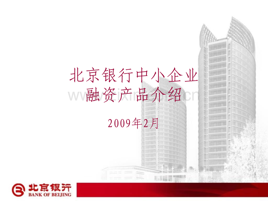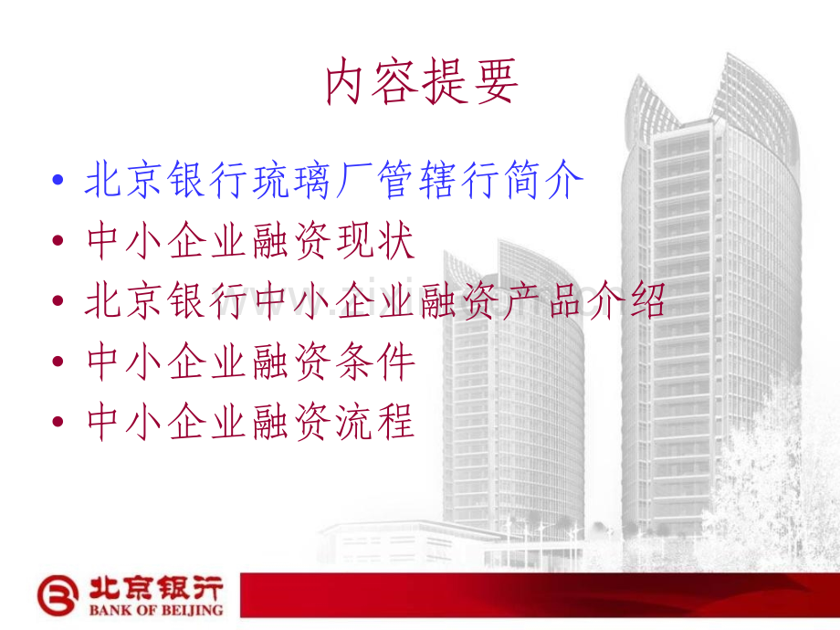 北京银行中小企业融资产品介绍2009年2月内容提要北京银行琉璃厂管辖行简介中小企业融资现状北京银行中小企业融资产品介绍中小企业融资条件中小企业融资流程关于琉璃厂管辖行网点地址:琉璃厂支行:宣武区南新华街48号1-2层(琉璃厂文化街以南,原厂甸大楼)宣武门支行:宣武区广安门大街6号(菜市口移动营业厅以西,枫华豪景写字楼一层)东高地支行:丰台区东高地万源西里41栋关于琉璃厂管辖行宣武区片的业务牵头行,我行与金正资产以及金正光彩自2002年开始合作,三方签署有关于为宣武区中小企业贷款业务合作协议,重点扶持宣武区中小企业及科技企业。自合作以来,担保方已累计为23家小企业提供贷款担保53笔,累计贷款金额9445万元。截至08年末,各项贷款余额达32亿元,整体业务水平在全行系统中名列前茅。经典案例从50万到1700万的飞跃关于北京银行北京银行成立之初就定位于服务北京地区的企业,特别是中小企业北京银行是目前北京地区中小企业贷款业务量最多的银行之一中小企业融资服务是北京银行未来的发展战略目标曾经创造了许多扶持小企业的经典案例内容提要北京银行琉璃厂管辖行简介中小企业融资现状北京银行中小企业融资产品介绍中小企业融资条件中小企业融资流程中小企业融资现状 目前,中小企业超过30%的融资来自非正规金融途径,中小企业贷款仅占银行各项贷款的16,距离小企业贷款的实际需求还有很大空间。非正规途径融资存在的主要问题包括融资稳定性差、财务成本成本高,不利于企业信用积累等。正规渠道融资的难点对银行业务不了解怕业务流程太繁琐担心贷款利率太高找不到合适的担保方式 内容提要北京银行琉璃厂管辖行简介中小企业融资现状北京银行中小企业融资产品介绍中小企业融资条件中小企业融资流程北京银行中小企业融资产品1.流动资金贷款2.固定资产贷款3.银行承兑汇票4.商铺担保贷款5.订单贷款 北京银行中小企业融资产品1、流动资金贷款:用途:季节性生产、储备、集中购料、节日供应等原因原因:自有流动资金不足特点:临时周转性贷款贷款期限一般一年(含)以内北京银行中小企业融资产品2、固定资产贷款:用途:固定资产的资金投入原因:外延扩大再生产,包括新建、扩建、改建和重建等基本建设方面的投资或技术改造特点:时间长、项目手续多期限:根据项目回款周期确定北京银行中小企业融资产品3、银行承兑汇票:包括承兑、贴现、买方付息承兑等申请企业申请企业银行银行企业2(贸易对象)承兑协议贸易合同贸易对象贸易对象承兑付款存入保证金还款北京银行中小企业融资产品4、商铺担保(小商品市场):担保人(市场)担保人(市场)北京银行北京银行保保证证担担保保存存入入担担保保基基金金提供反担保提供反担保发放贷款发放贷款小企业小企业A小企业小企业B小企业小企业C.北京银行中小企业融资产品5、订单贷款(大中型企业业务链、结算链)小企业小企业北京银行北京银行大中型企业大中型企业贸易合同贸易合同打入货款用以还款打入货款用以还款发放贷款发放贷款签订签订三方协议三方协议内容提要北京银行琉璃厂管辖行简介中小企业融资现状北京银行中小企业融资产品介绍中小企业融资条件中小企业融资流程中小企业融资条件主体资格法人营业执照的有效性财务管理要求独立核算、自负盈亏、财务制度健全,帐表完整,数字准确资本要求资本金到位、有一定的流动资金、流动资产一般不得小于流动负债中小企业融资条件经营场所要求在本市或异地有固定的生产经营场所结算要求在申请贷款行建有基本帐户或一般帐户还款能力要求无不良信用记录,具备还款来源和能力担保要求提供银行认可的保证、抵押、质押担保中小企业融资的限制性条件企业自身、关键人或股东有不良贷款或不良贷款或担保;担保;主要管理人员涉嫌重大违法违纪涉嫌重大违法违纪案件;企业发生或涉入重大诉讼或仲裁案件涉入重大诉讼或仲裁案件;背景不详背景不详,关联交易情况无法查清。内容提要北京银行琉璃厂管辖行简介中小企业融资现状北京银行中小企业融资产品介绍中小企业融资条件中小企业融资流程中小企业融资流程企业向我行提出贷款需求企业按照要求提供相关资料我行初审资料并提出建议的担保方式我行进行贷前调查,形成调查报告确定贷款金额、期限、利率等具体内容完成担保手续我行与企业签订借款合同、完成放款到期还本付息,单笔业务完成1 1、中小企业贷款须提交的资料、中小企业贷款须提交的资料1)书面借款申请书;2)经审计的近三年度和近期财务报表;3)经年检的营业执照副本、组织机构代码证、贷款卡;4)法人代表资格证明及身份证复印件;5)法人权力机构同意借款的决议;6)公司章程;7)验资报告;1 1、中小企业贷款须提交的资料、中小企业贷款须提交的资料8)企业领导人情况说明;9)法定代表人授权委托书及授权人、被授权人身份证复印件;10)特定行业的资质证书、许可证、批文;11)担保人、抵质押物的有关资料;12)与业务相关的其他材料。2 2、中小企业贷款的担保方式、中小企业贷款的担保方式连带责任保证担保法人连带责任个人连带责任抵押担保房地产抵押动产抵押质押担保权利质押动产质押2 2、中小企业贷款的担保方式、中小企业贷款的担保方式 个