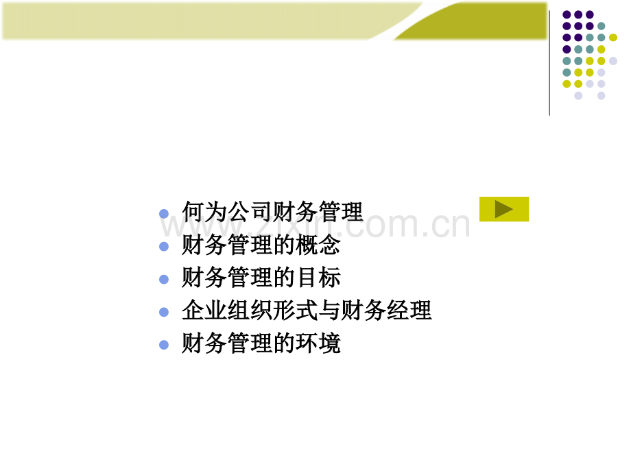 财务管理的基本知识结构财务管理的基本知识结构l1、树立两种观念:时间价值观念、风险与收益观念;l2、进行一项分析:财务分析;l3、掌握四类技能:筹资引起的财务活动、投资引起的财务活动、经营引起的财务活动和分配引起的财务活动的管理技能。2024/10/5 周六第一章 总 论l何为公司财务管理何为公司财务管理l财务管理的概念财务管理的概念l财务管理的目标财务管理的目标l企业组织形式与财务经理企业组织形式与财务经理l财务管理的环境财务管理的环境何为公司财务管理?何为公司财务管理?Finance的含义的含义l研究个人和机构(Agents)如何在不确定条件下,对资金进行跨时空最优配置。l要素l时间l风险何为公司财务管理?何为公司财务管理?恐龙蛋游戏软件设计公司的问题恐龙蛋游戏软件设计公司的问题l恐龙蛋游戏软件设计公司,前一阵子推出水浒传网络游戏软件。这个公司成立迄今已有三年,已推出四个颇受市场欢迎的游戏软件,公司预计本年度的营收将达2亿元。l目前,这家公司资本额为2000万元,此外,为了筹措营运所需资金,公司准备将自有的厂房及仓库抵押给银行以取得4千万元担保放款。这家公司还计划进一步将营业项目扩展到商用以及教育应用软件的开发设计。何为公司财务管理?何为公司财务管理?恐龙蛋游戏软件设计公司的问题恐龙蛋游戏软件设计公司的问题l为了这些扩充计划,公司财务副总经理发现现有的资金筹措方式将不足以应付未来公司对资金的需求。更严重的是,公司将立即面临短期营运现金不足的问题。l为了公司业务发展的需要,公司的部分原有投资者建议今年进行少量分红,将资金用于支持公司的发展。何为公司财务管理?何为公司财务管理?企业的契约模型企业的契约模型 企业供应商管理者员工客户债权人股东债务人社会政府何为公司财务管理?何为公司财务管理?企业理财的内涵企业理财的内涵“一个企业所做的每一个决定都有其财务上的含义,而任何一个对企业财务状况产生影响的决定就是该企业的财务决策。因此,从广义上讲,一个企业所做的任何事情都属于公司理财的范畴。”达摩达兰第一章 总 论l何为公司财务管理何为公司财务管理l财务管理的概念财务管理的概念l财务管理的目标财务管理的目标l企业组织形式与财务经理企业组织形式与财务经理l财务管理的环境财务管理的环境公司财务活动是以现公司财务活动是以现金收支为主的资金收支金收支为主的资金收支活动的总称。这些财务活动的总称。这些财务活动构成了财务管理的活动构成了财务管理的内容。内容。1.财务管理的内容企业财务活动企业财务活动企业筹资引起的财务活动企业筹资引起的财务活动企业投资引起的财务活动企业投资引起的财务活动企业经营引起的财务活动企业经营引起的财务活动企业分配引起的财务活动企业分配引起的财务活动1.财务管理的内容筹资筹资投资投资经营经营分配分配内部筹资内部筹资退出企业退出企业外部筹资外部筹资 企业企业国家国家债权人与债权人与债务人债务人投资者与被投资者与被投资者投资者企业职工企业职工企业财务关系企业财务关系第一章 总 论l何为公司财务管理何为公司财务管理l财务管理的概念财务管理的概念l财务管理的目标财务管理的目标l企业组织形式与财务经理企业组织形式与财务经理l财务管理的环境财务管理的环境 l以利润最大化为目标以利润最大化为目标l以企业价值最大化为目标以企业价值最大化为目标2.财务管理的目标财务管理的目标是财务管理的目标是公司理财活动所希望公司理财活动所希望实现的结果,是评价实现的结果,是评价公司理财活动是否合公司理财活动是否合理的基本标准。理的基本标准。以利润最大化为目标财务报表会计等式利润表收入-费用+直接计入当期损益的利得和损失=净利润净利润-股利分配=留存收益(盈余公积+未分配利润)资产负债表资产=负债+股东权益 =负债+股本+资本公积+留存收益(盈余公积+未分配利润)财务报表之间的钩稽关系财务报表之间的钩稽关系以利润最大化为目标l有有A A、B B两个企业,其利润都是两个企业,其利润都是100100万元万元 ,哪一个,哪一个企业的理财目标实现得更好?企业的理财目标实现得更好?l如果如果A A企业是今年赚取的企业是今年赚取的100100万元,而万元,而B B企业是去年企业是去年赚取的赚取的100100万元利润,哪个企业更好?万元利润,哪个企业更好?l如果如果A A、B B企业都是今年赚取的企业都是今年赚取的100100万元,哪个企业万元,哪个企业更好?更好?l如果如果A A企业赚的企业赚的100100万元全部收回了现金,而万元全部收回了现金,而B B企业企业全部是应收账款,哪个企业更好?全部是应收账款,哪个企业更好?l如果如果A A、B B企业同时赚取的企业同时赚取的100100万元利润都是收回了万元利润都是收回了现金,哪个企业更好?现金,哪个企业更好?l在上面的条件下,如果在上面的条件下,如果A A企业是投资企业是投资100100万元建成万元建成的,而的,而B B企业是投资企业是投资500500万元建成的,哪个企业更万元建成的,哪个企业更好?好?思考思考以利润最大化为目标l主要缺点:主要缺点:l没有考虑资金的时间价值没有考虑资金的时间价值 l没能有效地考虑风险问题没能有效地考虑风险问题 l没有考虑利润与