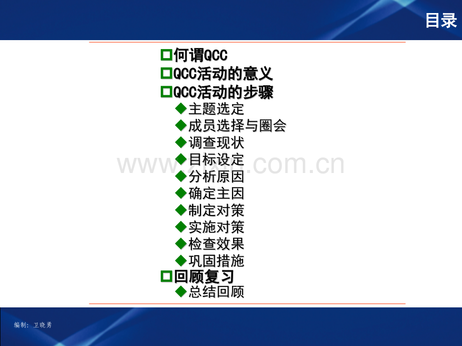 编制:卫晓勇QCC(QCC(质量圈质量圈)卫晓勇卫晓勇 编制:卫晓勇pp何谓何谓何谓何谓QCCQCCQCCQCCppQCCQCCQCCQCC活动的意义活动的意义活动的意义活动的意义ppQCCQCCQCCQCC活动的步骤活动的步骤活动的步骤活动的步骤pp回顾复习回顾复习回顾复习回顾复习uu主题选定主题选定uu成员选择与圈会成员选择与圈会uu调查现状调查现状uu目标设定目标设定uu分析原因分析原因uu确定主因确定主因uu制定对策制定对策uu实施对策实施对策uu检查效果检查效果uu巩固措施巩固措施uu总结回顾总结回顾目录目录 编制:卫晓勇 品管圈起源品管圈起源-始于日本始于日本二十世纪初一些国家先后推行了全面质量管理,又广泛进行了二十世纪初一些国家先后推行了全面质量管理,又广泛进行了质量管理知识的培训,在此基础上,日本于质量管理知识的培训,在此基础上,日本于2020世纪世纪6060年代首创年代首创了了QCQC小组活动。小组活动。QCC QCC 被认为是日本生产力神奇配方的重要成分,使日本在生产被认为是日本生产力神奇配方的重要成分,使日本在生产力增长率方面在过去的几年来一直处于领导的地位,成为每小力增长率方面在过去的几年来一直处于领导的地位,成为每小时生产量最高的国家。时生产量最高的国家。何谓何谓QCC 编制:卫晓勇 台湾是第一个在东南亚有规模地推广台湾是第一个在东南亚有规模地推广QCCQCC的地方,每年有超过十的地方,每年有超过十万个万个QCC QCC 正在运行。在中国大陆由正在运行。在中国大陆由19781978年开始,年开始,我国的第一个我国的第一个质量管理小组(质量管理小组(QCQC小组)在北京内燃机总厂诞生,小组)在北京内燃机总厂诞生,目前每年有目前每年有超过一百万个超过一百万个QCC QCC 正在运行。正在运行。品管圈起源品管圈起源-中国正在推广中国正在推广何谓何谓QCC 编制:卫晓勇品管圈指的是由同一个工作场所的人(6 人左右),为了要解决工作问题,突破工作绩效,自动自发的合成一个小团体,然后分工合作,应用品管的简易统计手法当工具,进行分析,解决工作场所的障碍问题以达到业绩加强及改善之目标.Quality Control CircleQuality Control Circle(品管圈或质量圈)(品管圈或质量圈)(品管圈或质量圈)(品管圈或质量圈)QCCQCC的定义的定义何谓何谓QCC 编制:卫晓勇n所有的品管圈都持有共同的想法,身处现场的你与你的同事们是真正最了解你们工作范围内问题的人。因此你们最能够帮助解决这些问题或者加以改善。n常言道,三个臭皮匠,顶个诸葛亮。因此当你与你的同事集合在一起解决问题时,往往能够提出更好的解决方法。品管圈的作用品管圈的作用何谓何谓QCC 编制:卫晓勇n参加品管圈活动你可以得到许多益处,你会学到新的技能,参加品管圈活动你可以得到许多益处,你会学到新的技能,例如:例如:如何使用简单的统计方法(如品管的七个工具等)如何使用简单的统计方法(如品管的七个工具等)当众演讲的能力当众演讲的能力有效的领导能力有效的领导能力n你能够更加了解你的同事,加深彼此感情。你能够更加了解你的同事,加深彼此感情。n你的贡献将被公司的管理层所承认。你的贡献将被公司的管理层所承认。n你的作用将得到大家的认可。你的作用将得到大家的认可。品管圈的意义品管圈的意义何谓何谓QCC 编制:卫晓勇 毫无疑问,品管圈是用来解决问题的!毫无疑问,品管圈是用来解决问题的!实际的情况与所期望的情况之间的差距就是实际的情况与所期望的情况之间的差距就是“问题问题”。这造成顾客。这造成顾客的投诉、时间、金钱及资源的浪费。的投诉、时间、金钱及资源的浪费。那什么是问题?那什么是问题?QCC活动的意义活动的意义 编制:卫晓勇许多的问题由管理层来处理往往更加合适许多的问题由管理层来处理往往更加合适例如员工的薪水与假期等问题。这里管理层由责任去解决它们!例如员工的薪水与假期等问题。这里管理层由责任去解决它们!但是还有很多问题是我们能够解决的,不论你的工作是负责生产零但是还有很多问题是我们能够解决的,不论你的工作是负责生产零部件还是直接和客户打交道。我们部件还是直接和客户打交道。我们不能不能将问题将问题“视而不见视而不见”QCC活动的意义活动的意义工作上的问题工作上的问题 编制:卫晓勇大部分的问题可归为三类:品质、成本及交货问题。大部分的问题可归为三类:品质、成本及交货问题。这恰恰正是我们这恰恰正是我们德朔质量方针德朔质量方针的核心!的核心!QCC活动的意义活动的意义问题的种类问题的种类通过公司所有员工积极参与,在质量、成本和交期三个方面的通过公司所有员工积极参与,在质量、成本和交期三个方面的持续改善,追求客户满意程度的持续提高。持续改善,追求客户满意程度的持续提高。编制:卫晓勇n维持或改善品质减少损坏率维持或改善品质减少损坏率n减少输往下一个生产程序的不合减少输往下一个生产程序的不合格产品及减少他们的申诉。格产品及减少他们的申诉。n减少顾客的投诉,改善对顾客的减少顾客的投诉,改善对顾客的服务!服务!QCC活动的意义活动的意义品管圈能够解决品管圈能够解决品质问题品质问题的例子的例子 编制:卫晓勇 降低成本降低成本n减少资源的浪费减少资源的浪费n减少用水和工具的损坏减少用水和工具的损