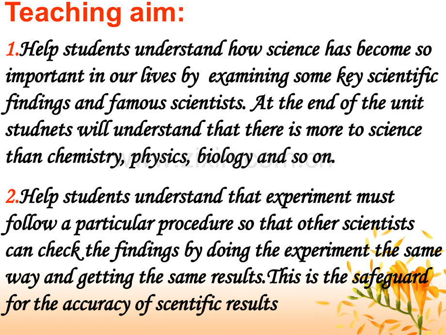 Module 5Teaching aim:1.1.Help students understand how science has become so Help students understand how science has become so important in our lives by examining some key scientific important in our lives by examining some key scientific findings and famous scientists.At the end of the unit findings and famous scientists.At the end of the unit studnets will understand that there is more to science studnets will understand that there is more to science than chemistry,physics,biology and so on.than chemistry,physics,biology and so on.2.2.Help students understand that experiment must Help students understand that experiment must follow a particular procedure so that other scientists follow a particular procedure so that other scientists can check the findings by doing the experiment the same can check the findings by doing the experiment the same way and getting the same results.This is the safeguard way and getting the same results.This is the safeguard for the accuracy of scentific resultsfor the accuracy of scentific resultsTeaching Arrangement:Period 1:Warming up(P1);Listening(P41);Project(P47)Period 2:Pre-reading,Reading and comprehending(P1-3)Period 3:Language pointsPeriod 4:Using language-listening and speaking;Reading and writing(P5-7)Period 5:Language points and GrammarPeriod 6:Listening(P44;Reading(P45-46)Period 7:Writing(P8 or P47)In the 18th and 19th centuries scientists all over the world made many important discoveries.Name some famous scientists.What are they famous for?Play a game called“Who Am I?”Group DiscussionThe First periodPut forward a theory about black holesStephen HawkingBorn in England in1942Marie Curie Discovered radiumTwo Nobel prizes,one for physics(1903)and one for chemistry(1911)Thomas EdisonThe Inventions of Thomas Edison Phonograph 留声机留声机LightbulbMotion PicturesHe invented the way of giving electricity to everybody in large cities(1663-1729)British,improved the first steam pump and turned it into a steam engine for taking water out of mines in 1712.Thomas Newcomen Charles Darwin(1808-1882)Gregor Mendel(1822-1884)In 132 he invented the first seismograph for measuring earthquakes.Zhang Heng78-139Mona LisaLast Supper(1452-1519)Italian artistLeonardo da VinciSir Humphry Davy(1778-1829)BritishMiniature Miners Safety Lamp Yuan Longping-Father of Hybrid Rice Who said?I saw rice plants as tall as Chinese sorghum,”he said of a dream he once had,“each ear of rice as big as a broom and each grain of rice as huge as a peanut.Albert Einstein Theory of Relativity Pair WorkA-a reporterB-one of the ten scientistsUse the following questions to help you:Whats your nationality?(Im from)What are you interested in?What conclusion have you drawn?What are you proud of?What leads to your success?(My cautiousness/creativeness/determinationleads to)Carl Linnaeus(1707-1778)Swedish He is often called the Father of Taxonomy(分类学分类学).He succeeded in classifying the plants and animals into a system they worked.Listening Which plant and animal do you like best?Can you classify them into a system?P41 Listening1.Choose which of the following statements most closely describes what this listening passage is about.Explain why the others are wrong.A.This is about a man who wants to name a flower.B.This is about a man who finds a flower and wants to own it.C.This is about a man who finds a flower and wants to know if it is a new species of flower.2.Listen to the tape again and try to complete the following passage.To find the name of the unknown flower,first you have to go to see a flower _.He/She will look in a special _ written by Carl Linnaeus.He lived in _ from _to _.He was very important because he solved a serious problem for _.He saw all plants and animals produce _.Some animals produce _ but others lay _ while plants _.He used these specialistyoung plants and animalsbiology17781707Swedenbookeggsproduce seedsbabiesdifferent ways of producing young to put plants and animals into _.For example,the group called birds lay _ to produce young and they all have _.Linnaeus put the plants and animals into smaller groups or species.He gave each one two names.One is for the large group,for example _ and one is for the species,for example _.So a parrot would be _.He was the first person to successfully classify(分类分类)all plants and animals.bird,parrotparrotbirdfeatherseggsgroups3.Make a phone call according to the following situation Imagine you are going to meet a specialist about a newly-found flower.Your partner will be the assistant for the flower specialist.You both need a description of the other so you can recognize each other when you meet.Now ring the assistant to sort out the necessary information.Pair work (Using the following sentences)How will I recognize you?What special features do you have?What will you wear?How will I know you?What do you look like?You can recognize me becauseIm tall/short,fat/thin,young/old withMylooks a bit likeI have large/small,brown/green eyes withUse the library or the internet to find out about important scientist in medicine,physics,chemistry,biology,astronomy or mathematics.Prepare a talk on your chosen scientists.Remember to include some information about their life,their achievements and why they are considered important in science history.Who is he?What is he famous for?SARS&Bird Fluinfectious diseaseThe Second PeriodKing CholeraBroad Street in 1854Bacteria of cholera Four outbreaks of cholera in the 1830s and 1840s killed many people in England.In 1854,“the most terrible outbreak of cholera which ever occurred in the kingdom”began.It was so violent and sudden that 127people died in the first three days.Group work:1.Do you know how to prove a new idea in scientific research?2.What order would you put the seven in?draw a conclusion think of a method collect results make up a question find a problem analyze the results find supporting evidence repeat if necessary1.Whats the main idea of the passage?A.John Snow was 