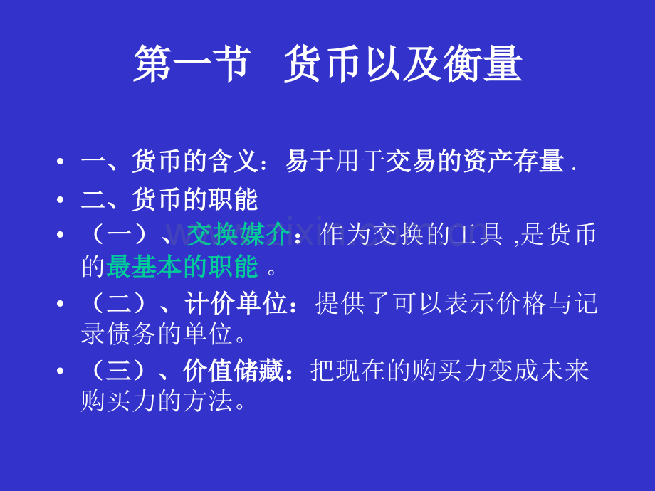 第一节第一节 货币以及衡量货币以及衡量一、货币的含义一、货币的含义:易于易于用于交易的资产存量交易的资产存量.二、货币的职能二、货币的职能(一一)、交交换换媒媒介介:作为交换的工具,是货币的最基本的职能最基本的职能。(二二)、计计价价单单位位:提供了可以表示价格与记录债务的单位。(三)、价值储藏:(三)、价值储藏:把现在的购买力变成未来购买力的方法。三、货币的衡量三、货币的衡量美国的货币衡量指标(资料来源美国的货币衡量指标(资料来源Federal Reserve)C:通货通货(M0)M1=C+活期存款活期存款+旅行支票旅行支票+其他支票存款其他支票存款M2=M1+小额定期存款小额定期存款+储蓄存款储蓄存款+货币市货币市场存款帐户场存款帐户+货币市场共同基金余额货币市场共同基金余额M3=M2+大额定期存款大额定期存款+回购协定回购协定+欧洲美欧洲美元元+只为机构服务的货币市场共同基金余只为机构服务的货币市场共同基金余额额L=M3+其他流动资产(如储蓄债券和短期其他流动资产(如储蓄债券和短期财政部有价证券)财政部有价证券)中国的货币衡量指标中国的货币衡量指标M0:CM1=M0+企企业业活活期期存存款款+机机关关团团体体部部队队存存款款M2=M1+企企业业定定期期存存款款+自自筹筹基基本本建建设设存存款款+居居民民储储蓄蓄存存款款+其其他他存存款款+证证券券公公司司客客户保证金户保证金(2001.7)M3=M2+金金融融债债券券+商商业业票票据据+大大额额可可转转让让定期存单定期存单一般地可以这样理解一般地可以这样理解M0=现金(硬币与纸币)M1=M0+商业银行的活期存款-狭义的货币狭义的货币M2=M1+小额定存(=10万美元+其他-广广义义的的货货币币M3=M2+大额定存+其他说明说明:存款货币存款货币(银行货币、信用货币)-商行的活期存款;近近似似货货币币(准货币)-商行的定存与其他储蓄机构的储蓄存款;货货币币替替代代物物-暂时替代货币起到交换媒介的作用(信用卡)第二节第二节 货币需求货币需求货币需求理论框架:货币需求理论框架:古典货币需求论(第一章)古典货币需求论(第一章)凯恩斯的观点凯恩斯的观点凯恩斯主义货币需求理论凯恩斯主义货币需求理论 新古典综合派的观点新古典综合派的观点 新剑桥学派的观点新剑桥学派的观点现代货币数量论(货币学派)现代货币数量论(货币学派)一一、含含义义:人人们们愿愿意意把把货货币币放放在在身身边边的的要要求求.凯恩斯把它称之为“流动性偏好”。二、货币需求的三个动机二、货币需求的三个动机(一一)交交易易动动机机:为了应付日常交易的而持币.LT=L(Y)(二二)预预防防动动机机(谨谨慎慎动动机机):为了应付非正常的交易而持币.LP=L(Y)资产分类(简单地)货币金融资产股票债券资产资产非金融资产(实物资产)(三)投机动机:(三)投机动机:指人们为了抓住有利的购买有价证券的机会而持有货币的动机。LSP=L(i)iLSP0LSP(流动性陷阱区间流动性陷阱区间)LSP三、货币需求函数与货币总需三、货币需求函数与货币总需求曲线(实际的需求)求曲线(实际的需求)(一一)货货币币需需求求函函数数:根据货币需求动机分析得,L=L1(Y)+L2(i)(二)货币总需求曲线:(二)货币总需求曲线:i L1=L1(Y)i i L2=L2(i)L1 L2L(三)货币总需求曲线的移动(三)货币总需求曲线的移动:i(Y1)(Y2)(Y3)L四、平方根定律(新古典综合四、平方根定律(新古典综合派的观点)派的观点)-鲍莫尔鲍莫尔-托宾模型托宾模型设设T为某人的月支出为某人的月支出(收入收入),C为月初持有的现金为月初持有的现金,则取款的次数则取款的次数(变现的次数变现的次数)n=T/C,b为每次变现为每次变现的的 成成 本本(如如 手手 续续 费费),则则 每每 月月 变变 现现 的的 成成 本本nb=(T/C)*b,每月平均持有现金量每月平均持有现金量M=C/2,例如月初收入为300元,每天支出10元,月底0元,月平均持有量为(300+0)/2=150元,则则 月月 利利 息息 损损 失失 为为i*(C/2),总总成成本本为为:TC=(T/C)*b+i*(C/2),要要使使TC最最小小,对对C求导并令为求导并令为0得:得:-Tb/C2+(1/2)*i=0,则则C=(2bT/i)1/2,最优持币量最优持币量M=C/2=(bT/2i)1/2,第三节第三节 货币供给货币供给一一、货货币币供供给给:人们可以得到的货币量。二、银行体系二、银行体系:(一)中央银行(一)中央银行 1、作作用用:发发行行货货币币的的银银行行;银银行行的的银银 行;国家的银行行;国家的银行 2、资产负债表、资产负债表资产 负债 外汇储备 现金发行现金发行 政府债券 商行的准备金商行的准备金 对商行的贷款中央银行的资产负债表中央银行的资产负债表(二)商业银行:(二)商业银行:资产负债准备金准备金 支票存款(活期存款)支票存款(活期存款)贷款(信用、抵押储蓄存款与投资(国库券、其它)定期存款其它资产其它负债(三)两者的关系中央银行资金市场商业银行资本市场非银行系统三、准备金制度三、准备金制度(一)法定准备金(率)(一)法定准备金(率):(二)超额准备金(率):(二)超额准备金(率):四、存款创造机制与货币乘数四、存款创造机制与货币乘数(一)存款创造的条件:(一)存款创造的条件:1、无超额准备金即、无超额准备金即Re=0;2、交交易易时时仅仅仅仅用用支支票票(用用活活期期存存款款签签发发支支票票,现金不在手中);现金不在手中);3、仅仅有活期存款,没有定期存款。、仅仅有活期存款,没