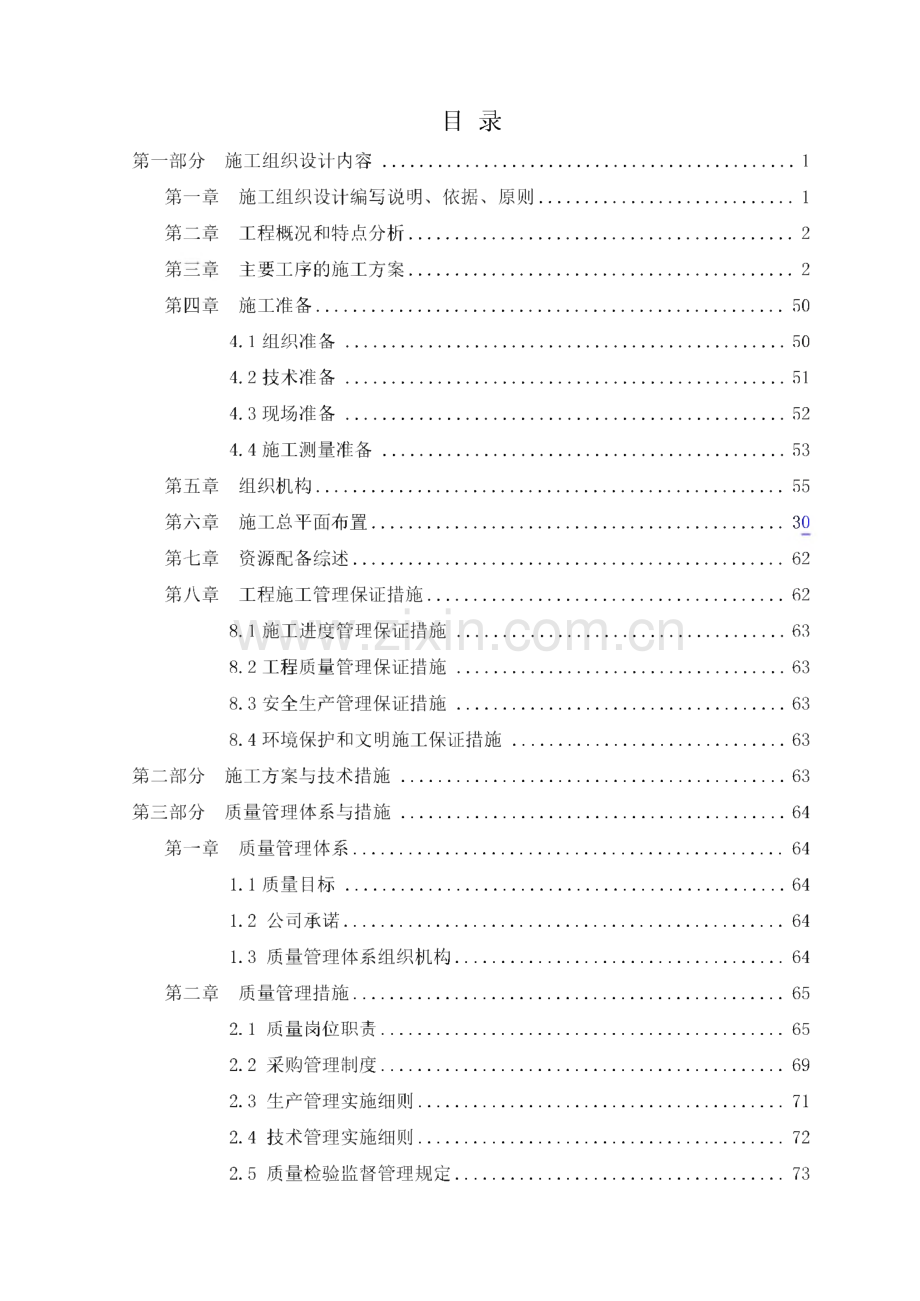 目录第一部分 施工组织设计内容.1第一章 施工组织设计编写说明、依据、原则.1第二章工程概况和特点分析.2第二章主要工序的施工方案.2第四章施工准备.504.1组织准备.504.2技术准备.514.3现场准备.524.4施工测量准备.53第五章组织机构.55第六章 施工总平面布置.30第七章资源配备综述.62第八章工程施工管理保证措施.628.1施工进度管理保证措施.638.2工程质量管理保证措施.638.3安全生产管理保证措施.638.4环境保护和文明施工保证措施.63第二部分施工方案与技术措施.63第三部分质量管理体系与措施.64第一章质量管理体系.641.1质量目标.641.2公司承诺.641.3质量管理体系组织机构.64第二章 质量管理措施.652.1 质量岗位职责.652.2采购管理制度.692.3生产管理实施细则.712.4技术管理实施细则.722.5质量检验监督管理规定.732.6自检、复检与终检制度.742.7 质量检验.752.8 计量器具管理制度.762.9 检验和试验状态标识的规定.762.10不合格品的控制管理规定.772.11纠正和预防措施的实施管理.7802.12仓库管理制度.7802.13施工质量记录管理.792.14服务管理制度.79第四部分安全管理体系与措施.81第一章安全、文明施工管理体系.811.1 安全、文明施工目标.811.2 安全管理、文明施工岗位职责.81第二章安全管理措施.852.1安全保证措施.852.2消防、安全保卫措施.872.3现场安全作业管理制度及措施.880第五部分环境保护管理体系与措施.91第一章环境保护管理体系.911.1 环境保护管理概述.911.2 环境管理体系及承诺.91第二章环境保护管理措施.932.1环境保护措施.932.2人群健康的保护措施.962.3水土保持管理体系与措施.97第六部分工程建设进度计划与措施.980第一章工程建设进度计划.9801.1施工进度编制原则.9801.2施工进度编制依据.9801.3施工进度计划.980第二章工程建设进度计划保证措施.992.1施工进度保证措施.992.2关键项目工期保证措施.1042.3计划工期延误的补救措施.105第七部分资源配备计划.106第一章劳动力安排计划与措施.1061.1设备人员动员周期.1061.2劳动力安排.10701.3劳动力管理措施.1080第二章材料采购计划与措施.10802.1物资供应商的选择.10802.2进场物资的验收.10802.3保证措施.109第三章主要机械投入计划与措施.1093.1 机械设备的使用管理措施.1093.2主要机械计划表.1093.3机械设备投入保证措施.109附件一:拟投入本标段的主要施工设备表.错误!未定义书签。附件二:拟投入本标段的试验和检测仪器设备表.错误!未定义书签。附件三:拟投入本标段的劳动力计划表.错误!未定义书签。第一部分施工组织设计第一章 施工组织设计编写说明、依据、原则1.1 编制说明在本工程施工中,我们将以优质、高效、安全、文明为施工宗旨,本着对业主 高度负责的态度,保证在施工工期内按合同文件中的质量标准和有关要求完成本工 程施工,并以力争以优良工程交付给业主。同时在施工过程中,我们司将积极与质 量监督部门、安全监督部门等单位密切配合,协调好关系,通过有效地对工序、材 料、人员进行环保措施,使声、光、尘污染得到有效控制,创建安全文明施工的示 范工地。我司将根据施工系统管理的原则,对本项目进行项目目标管理,对各工种和工 序施工流水进行组织、计划、优化、协调,同时做到合理安排,全程监控,力求达 到缩短工期,减少失误,降低成本,保证工程质量和施工安全。我公司已经通过了 IS09001质量、环境和职业健康三体系认证,已建立和完善 了一套完整的工程质量管理和保证系统。本工程将会严格按照“三体系”的管理要 求进行运作,现场施工根据施工组织设计既定的质量保证措施来进行施工过程控 制,发挥我司在人才设备、技术人员、机械设备的优势,实现工程既定的质量目标。本施工组织设计编制时对各分项工程的施工工期、质量目标、项目管理架构设 置与劳动力组织、施工进度计划控制、机械设备及周转材料配备、主要技术措施、安全、文明施工、环境保护措施及降低成本、推广新技术等诸多因素尽可能做到充 分考虑,突出其科学性、适用性及针对性。1.3编制原则我司在认真研究了工程施工招标文件和现场踏勘的基础上,针对本工程项目的 施工特点,结合我司在类似工程中的施工经验,遵循下列原则编制本工程施工组织 设计。(1)遵守和贯彻国家的有关法律、法规和规章制度。(2)对项目工程的特点、性质、工程量、工作量以及施工企业的特点进行综合分析,确定本工程施工组织设计的指导方针和主要原则。(3)符合施工合同约定建设期限和各项技术经济指标的要求。1(4)遵守基本建设程序,切实抓紧时间做好施工准备,合理安排施工顺序,及时形成工程完整的投产能力。(5)在加强综合平衡,调整好施工周期的施工密度,在改善劳动组织的前提 下,努力降低劳动力的高峰系数,做到连续均衡施工。(6)运用科学的管理方法和先进的施工技术,努力推广应用新技术、新工艺、新材料、新设备(以下简称“四新”),不断提高机械利用率和机械化施工的综合水 平,不断降低施工成本,提高劳动生产率。(7)在经济合理的基础上,充分发挥基地作用,提高工厂化施工程度,减少 现场作业,压缩现场施工场地及施工人员数量。(8)施工现场布置应紧凑合理,便于施工,符合安全、防火、环保和文明施 工的要求,提高场地利用率,减少施工用地。(9)加强质量管理,明确质量目标,消灭质量通病,保证施工质量,不断提 