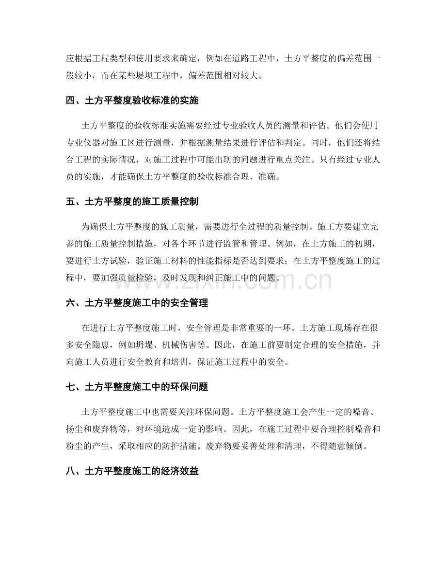 在进行土方平整度施工时,施工方要注意一些问题。首先是土方的含水量,过高或过低的含水量都会影响土方平整度的施工效果。土方松动时如果含水过高,容易形成泥浆;而含水过低时,土方容易出现晶体干裂。因此,在施工前,必须对土方进行水分调节和质检工作,保证土方松动性能符合要求。其次是施工机械的选用和施工工艺的改进。合适的施工机械和先进的施工工艺能够提高土方平整度和施工效率,减少土方平整度缺陷的产生。