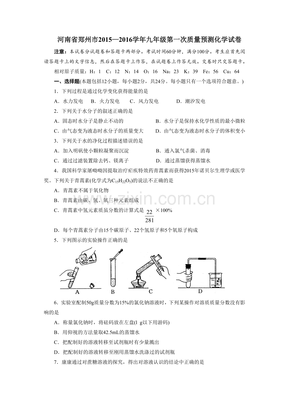 河南省郑州市2015—2016学年九年级第一次质量预测化学试卷