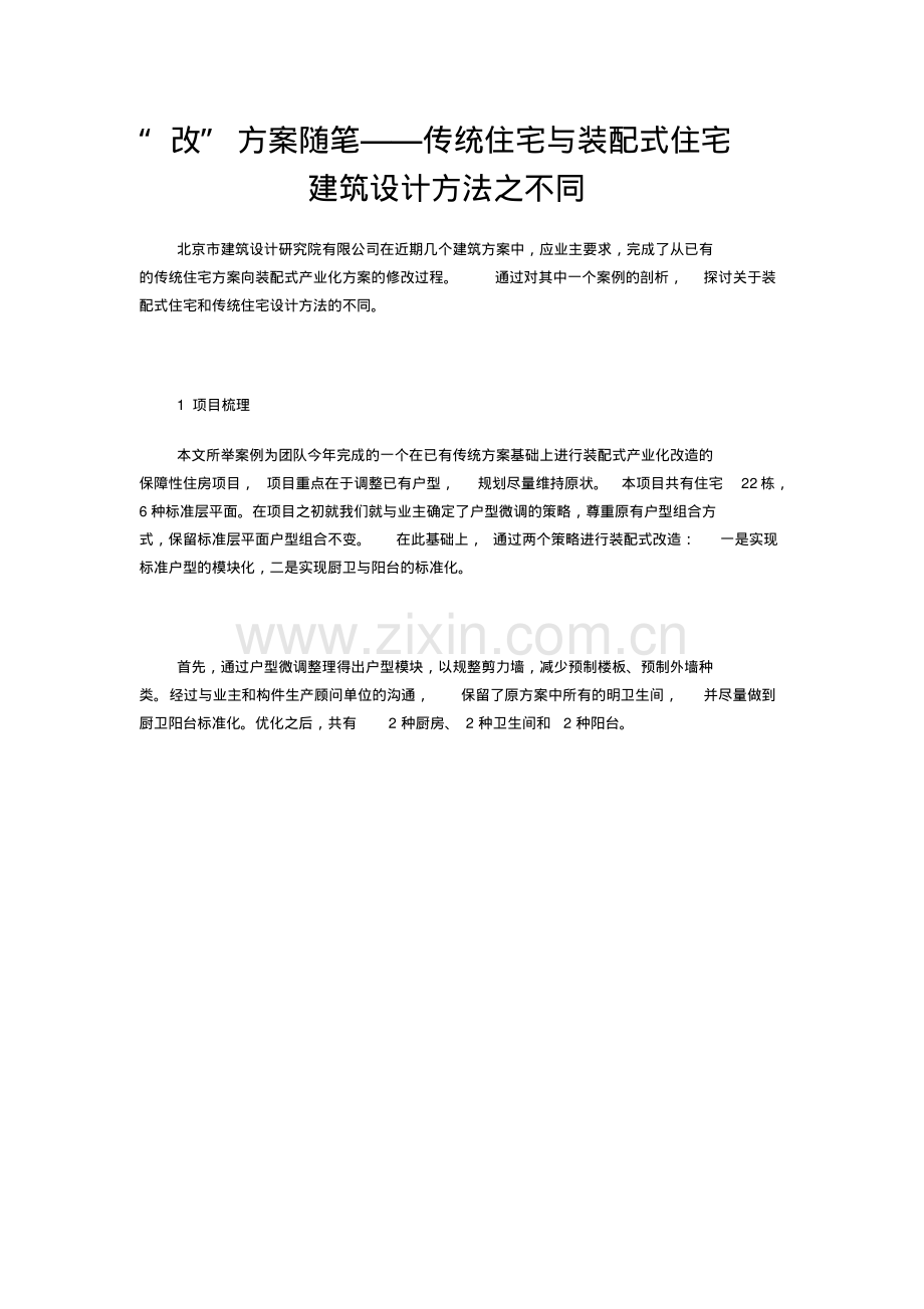 “改”方案随笔传统住宅与装配式住宅建筑设计方法之不同北京市建筑设计研究院有限公司在近期几个建筑方案中,应业主要求,完成了从已有的传统住宅方案向装配式产业化方案的修改过程。通过对其中一个案例的剖析,探讨关于装配式住宅和传统住宅设计方法的不同。1 项目梳理本文所举案例为团队今年完成的一个在已有传统方案基础上进行装配式产业化改造的保障性住房项目,项目重点在于调整已有户型,规划尽量维持原状。本项目共有住宅22 栋,6 种标准层平面。在项目之初就我们就与业主确定了户型微调的策略,尊重原有户型组合方式,保留标准层平面户型组合不变。在此基础上,通过两个策略进行装配式改造:一是实现标准户型的模块化,二是实现厨卫与阳台的标准化。首先,通过户型微调整理得出户型模块,以规整剪力墙,减少预制楼板、预制外墙种类。经过与业主和构件生产顾问单位的沟通,保留了原方案中所有的明卫生间,并尽量做到厨卫阳台标准化。优化之后,共有2 种厨房、2 种卫生间和2 种阳台。户型模块整理以下为改方案前后对比(彩色的为改造后的,黑白图为原方案)。以下为标准化厨卫和标准化阳台模块示意。在户型设计改造的同时,将修改后的户型带入原规划进行微调,以满足间距及日照要求,并保留原有规划组团布局及理念。以下为原规划总图与楼栋微调后规划叠加总图。2“改”建筑之设计方法对比2.1 着眼高度不同在传统住宅项目中,建筑单体或群体的规划设计仅是针对单独项目的需求,各小区是无关联的分散个体。在装配式住宅设计中,各个住宅小区都隶属于装配式住宅整体的宏大逻辑体系中,共享设计方法、装配构件、标准模块、标准楼栋等。在装配式建筑设计之初,就需要整体考虑本小区与全部装配式住宅体系的关系及与其他装配式住宅小区的关系。2.2 涉及阶段区别传统住宅项目在方案设计阶段一般仅涉及小区规划设计和建筑单体设计等阶段,而装配式住宅项目由于结构构件工厂生产、现场装配及内装装配化的要求,必须将设计向全过程延伸。从设计的初始阶段就需要开始考虑构件的拆分及精细化设计的要求,并在设计过程中与结构、设备、电气、内装专业紧密沟通,实现全专业、全过程的一体化设计。2.3 预期目标差异预期目标不同主要体现在装配式住宅设计比传统住宅更关注质量、成本、工期、效果与环保的综合评价。2.4 操作过程调整装配式住宅项目有别于一般住宅项目的操作过程。在传统住宅设计中,户型设计与规划设计是并行并重的两个过程。而在装配式住宅设计中,特别是在“改”项目中,最先亟待确定的问题既不是户型,也不是规划,而是修改的“度”,即对原有规划及单体设计的保留程度。不同的改造式装配式住宅项目具有不同工业化程度的预期目标,体现在模块的梳理整合程度、户型的种类、楼栋是否标准化等诸多方面。2.5 户型优化原则在本文列举的项目中,我们首先通过模块整理规整了剪力墙,实现了模块内部隔墙的灵活分隔,同时对有些户型的客厅和居室等空间的开间和进深进行了调整,使功能尺寸更为合理和符合内装设计、家具布置及人体工程学的原理。我们也遵循了2M,3M 模数原则,为内装的标准化预留了接口。以下为原标准层(上图)与修改后标准层(下图)平面示意。2.6 注重系统集成在装配式住宅设计中,集成系统的设计与运用已经成为了一种发展趋势。设备与电气管井的集中化设计与楼道布置相对于传统方式更具优势。在住宅系统中,将寿命较长的结构系统与寿命较短的设备管线系统分离,将设备管井公共空间化、集成化也是住宅设计的理性趋势,为在建筑的全生命周期中通过更新管线来延长建筑寿命提供了操作可能。2.7 设计标准体系户型模块方面,在对传统住宅户型的修改过程中,通过对轴线尺寸的调整和对剪力墙的梳理,使得装配式住宅户型趋于外形规整化;同时通过对剪力墙设计的调整,使得每个户型都由若干模块组成,模块外部尺寸固定而内部由轻质隔墙灵活分隔。交通核模块方面,适应产业化装配的要求,按规范及使用要求调整原交通核成为若干标准化交通核,包括楼梯的标准化、电梯井的标准化及机电管井和走道的标准化。以下为优化前后交通核示意。2.8 平面组合多样装配式住宅的模块化和标准化使得各户型可以进行多样组合,创造出板楼、塔楼、通廊式住宅等众多平面组合类型,以满足多样化的规划要求。2.9 建构墙层体系与传统住宅项目不同,装配式住宅项目的立面处理通过遵循“墙层”理论来实现立面形式的多样化。装配式包含了几何控制严格的建筑外墙面、预制阳台、预制外挂墙板及外墙功能构件及部品等“层”组成;其中外墙功能构件及部品分为栏杆、空调围挡及太阳能板三个部分。在装配式住宅建筑中,标准化的设计往往限定了几何尺寸不变的户型和结构体系,虽然固化了外墙的几何尺寸,但其色彩、光影、质感、纹理、组合及建构方式和顺序作为“墙层”要素都是可以“编辑”的。通过“墙层”的编辑,能够产生多样化的立面形式,例如“平板外墙+功能构件”类型、“平板外墙+预制挂板”类型、“平板外墙+集成窗”类型、“集成外墙”类型等,以下为墙层理论立面形象举例。以下为本项目装配式改造后立面形象的两个例子。注释:“墙层理论”由北京