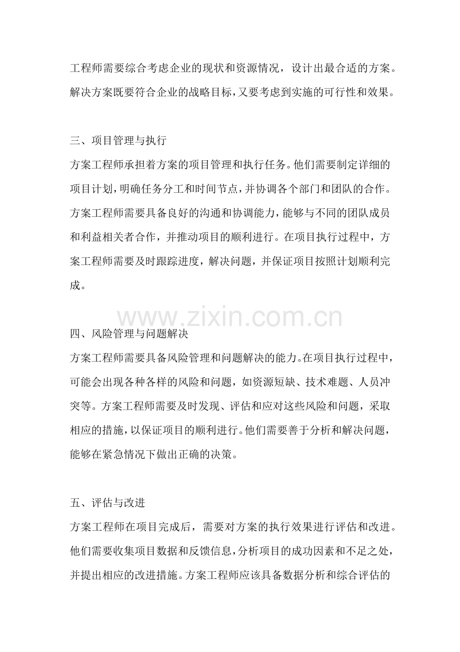 方案工程师是一种专业的职业角色,具备多方面的能力和知识。他们通过对企业需求的分析和问题的定义,制定出解决方案,并协调项目的执行和管理。在项目执行过程中,方案工程师需要具备风险管理和问题解决的能力,以保证项目的顺利进行。同时,他们还需要对项目的执行效果进行评估和改进,并与团队成员进行培训和知识分享。方案工程师的工作不仅仅是解决问题,更是推动企业发展的关键角色。